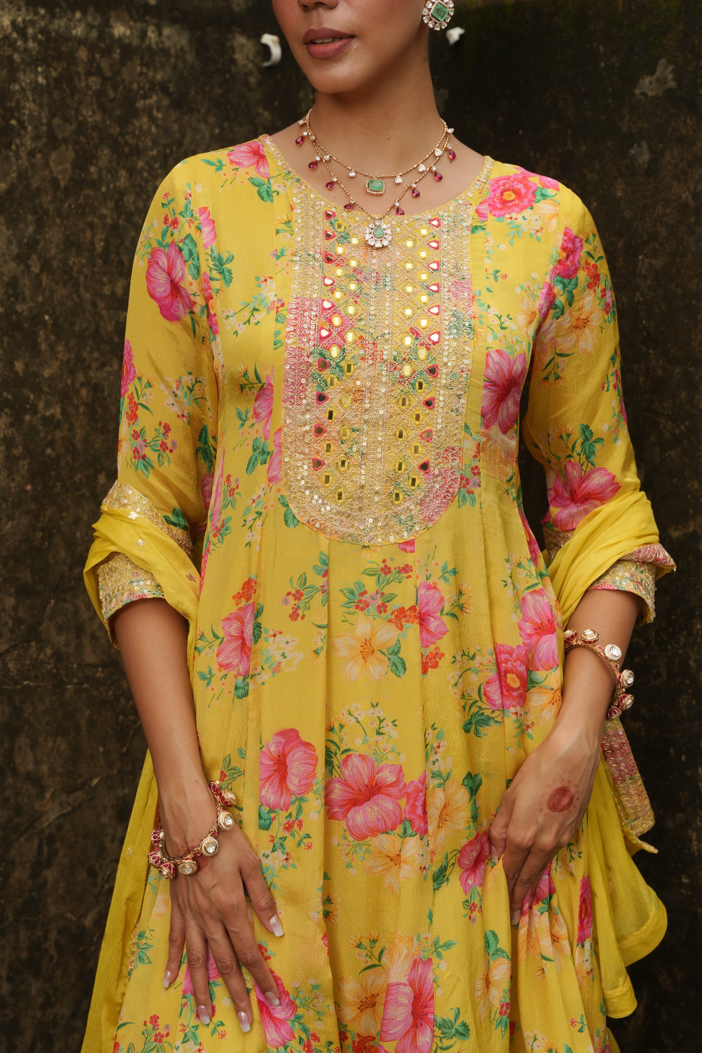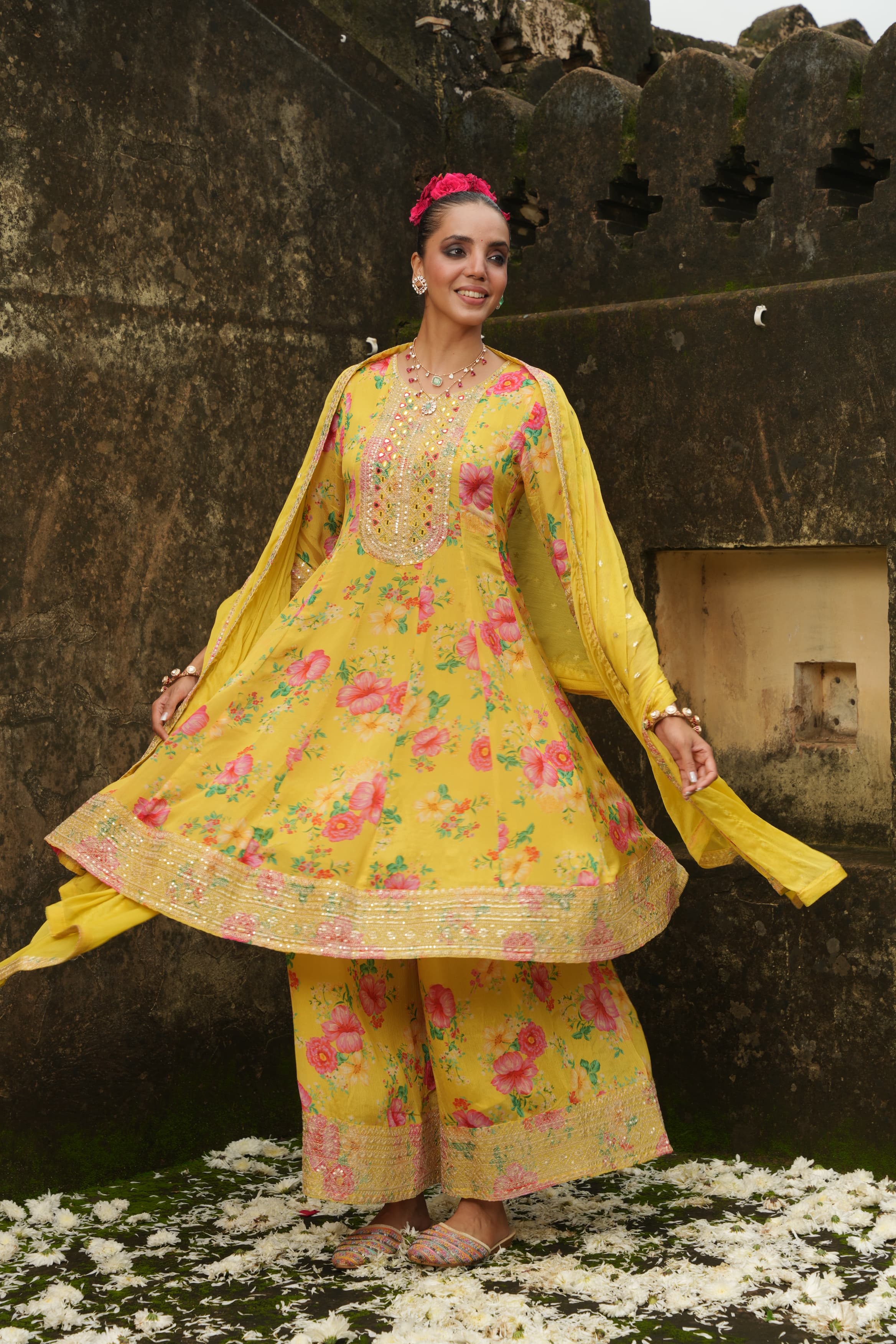 Celebrate traditions with a touch of modern vibrance in the Aarohi Suit Set. This ensemble blends heavy embroidery with floral prints, paired with embroidered pants and a festive dupatta, ideal for vibrant festive looks.