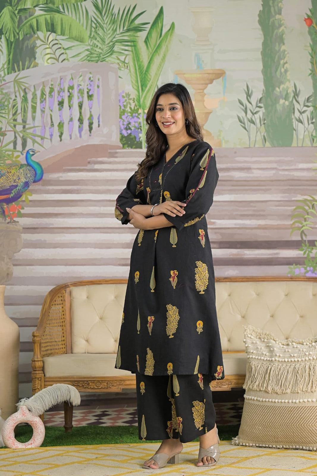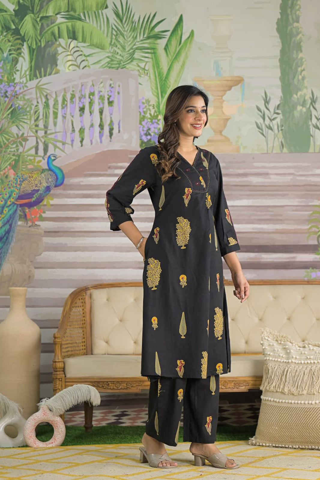 Printed with soft, earthy motifs and paired with a comfortable straight pant, this set is ideal for workwear, casual gatherings, or slow festive days when simplicity speaks loudest.
