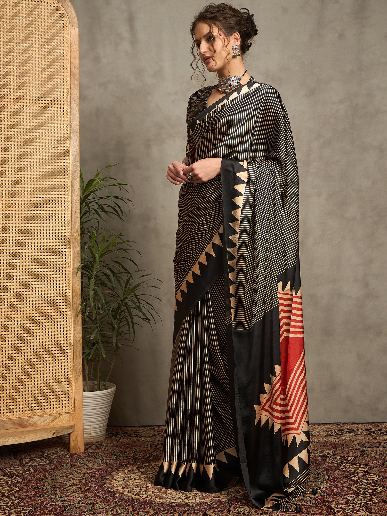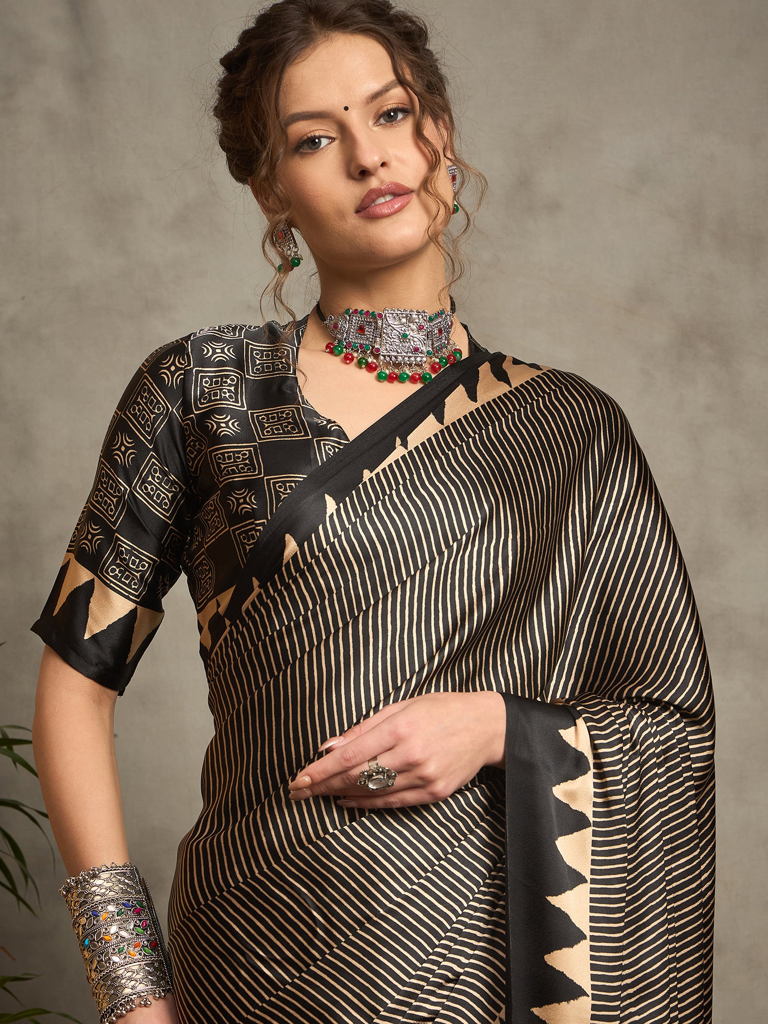 The Inaya Saree in Gajji modal satin blends contemporary charm with traditional grace. Its modern geometric print and silky finish make it perfect for small occasions or day wear.