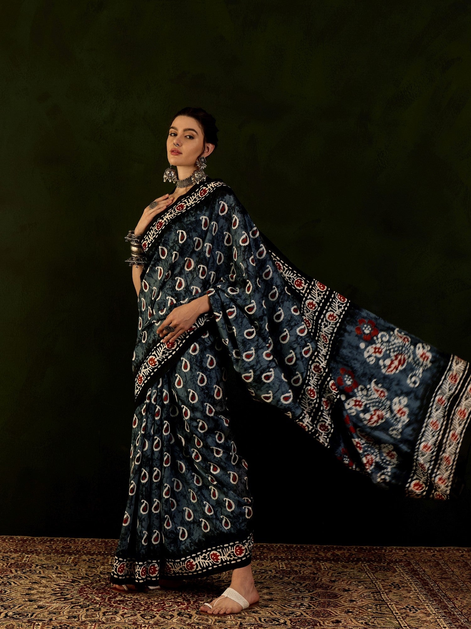 The Manika Saree, crafted in Bhagalpuri silk, features an Ikkat and Sanganeri-inspired print, reflecting artisanal charm. Lightweight and elegant, it’s perfect for daily wear or small gatherings.