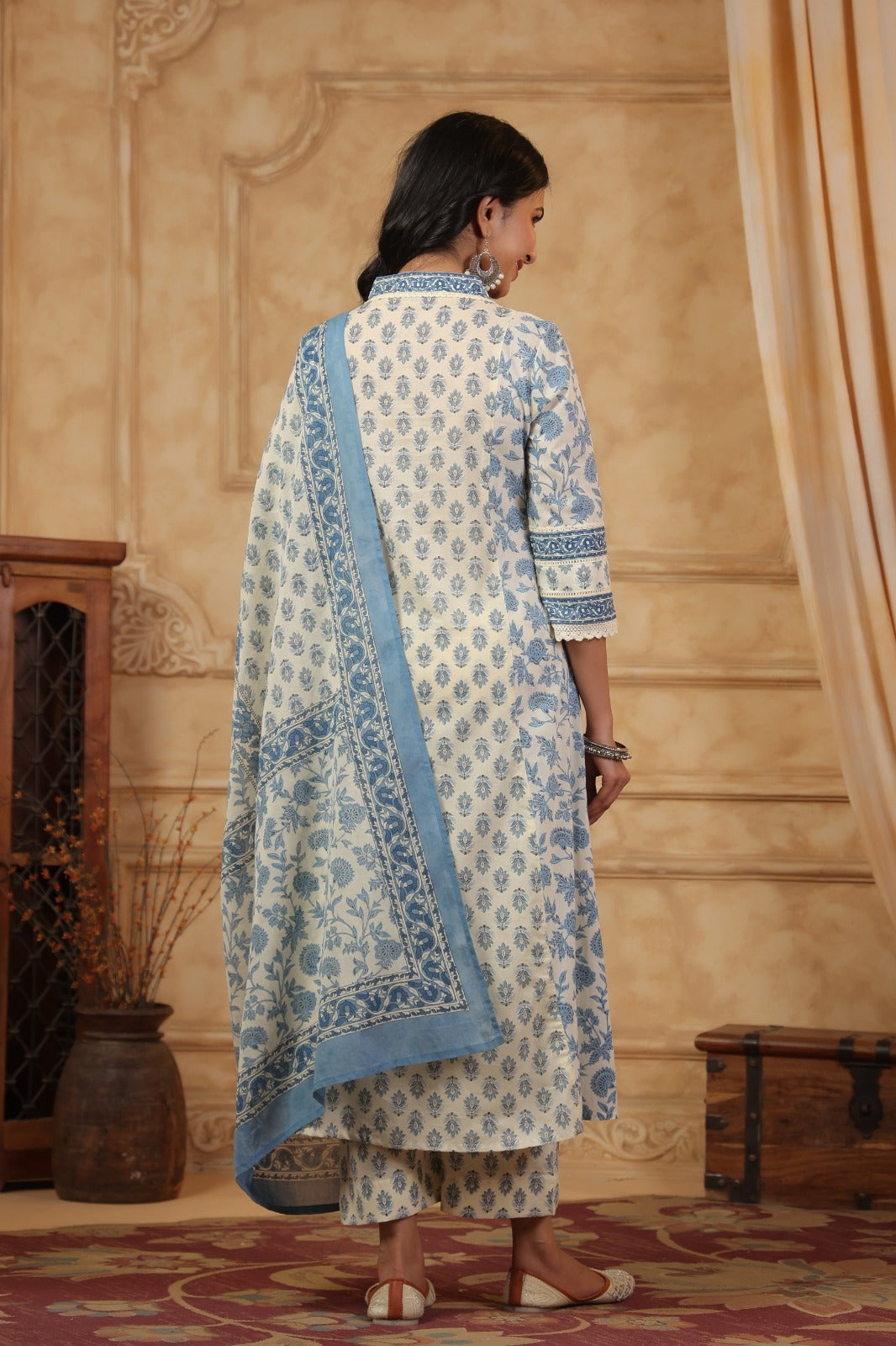 Breezy and beautifully balanced, the Noor  Suit Set is crafted in soft cotton with a light base and all-over prints, offering a refreshing touch to your everyday wardrobe. Designed in soothing, airy tones, the kurta features a flattering V-neckline and comes paired with a coordinated printed pant and dupatta for an effortlessly graceful look.