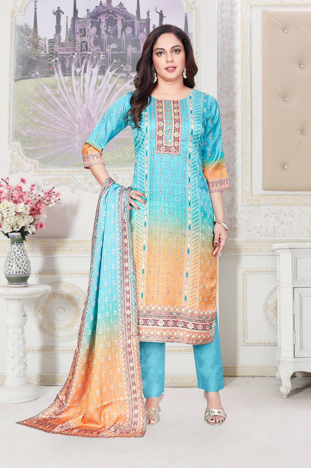 The Sangeeta Suit Set is a graceful everyday ensemble crafted in a printed rayon blend fabric with a soft ombre-look print. Paired with a printed dupatta and solid pants, this comfortable suit set features 3/4th sleeves and a relaxed silhouette, making it perfect for small gatherings, casual outings, and light festive days.