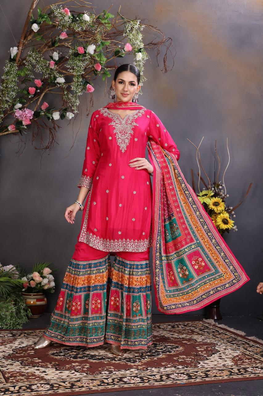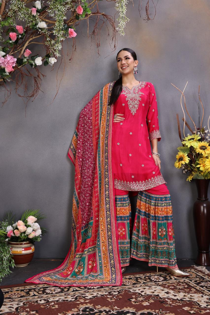 A festive masterpiece, the Chandni Suit Set combines heavy embroidery with elegant prints for a truly regal look. Featuring a 3-piece ensemble with gharara-style pants, this set is paired with a printed and embroidered dupatta that elevates its festive charm. Perfect for making a bold statement this season.