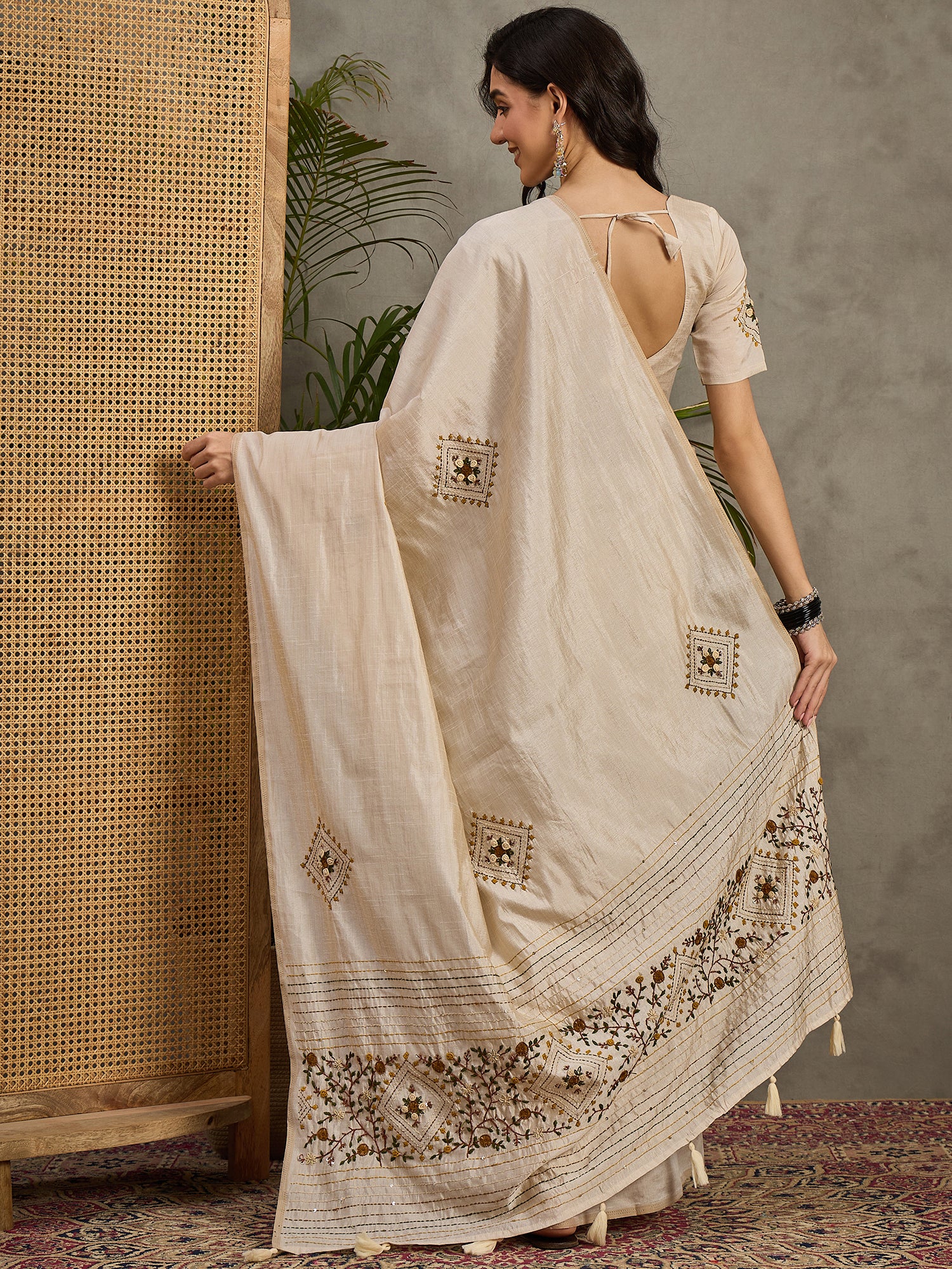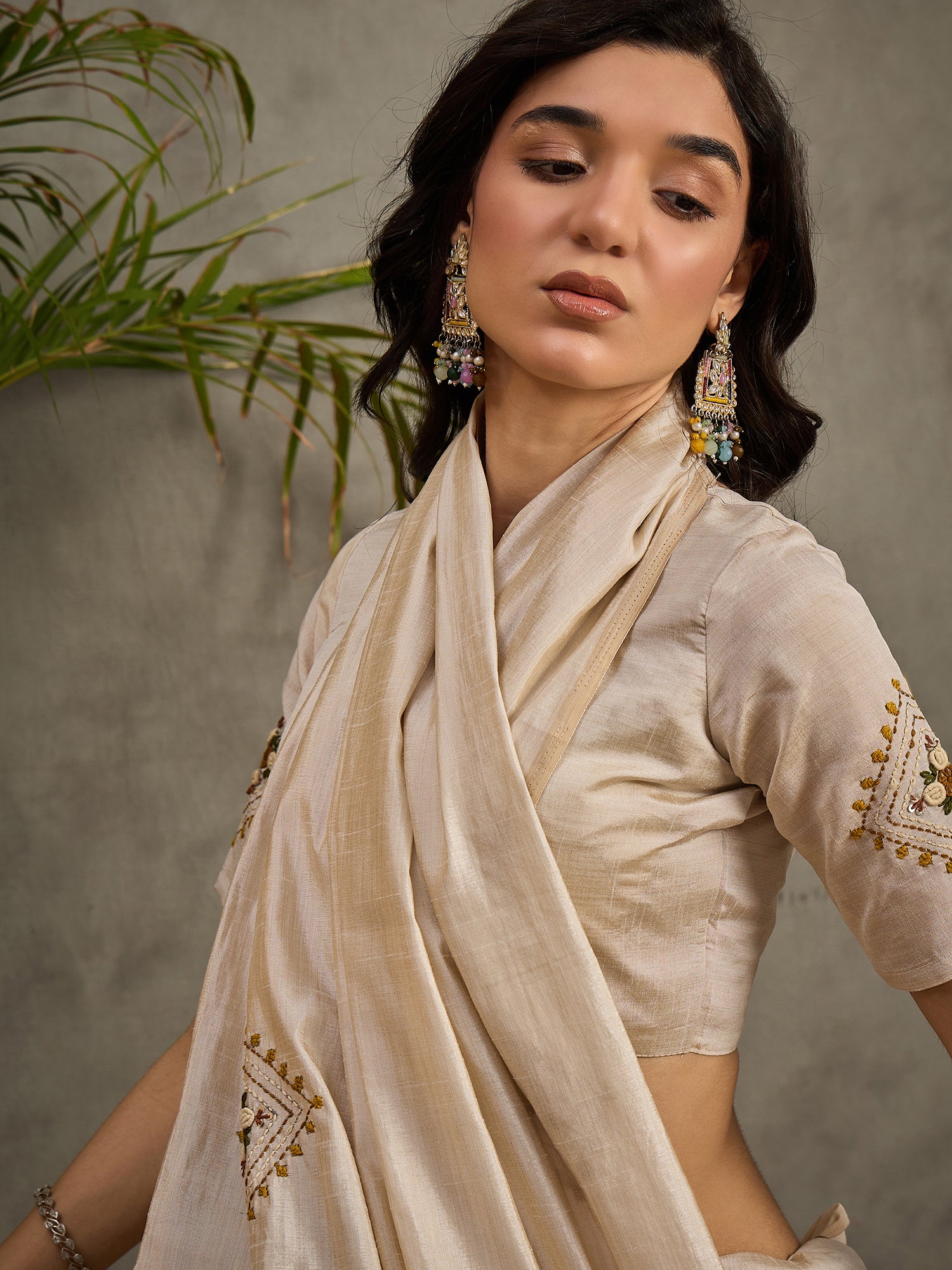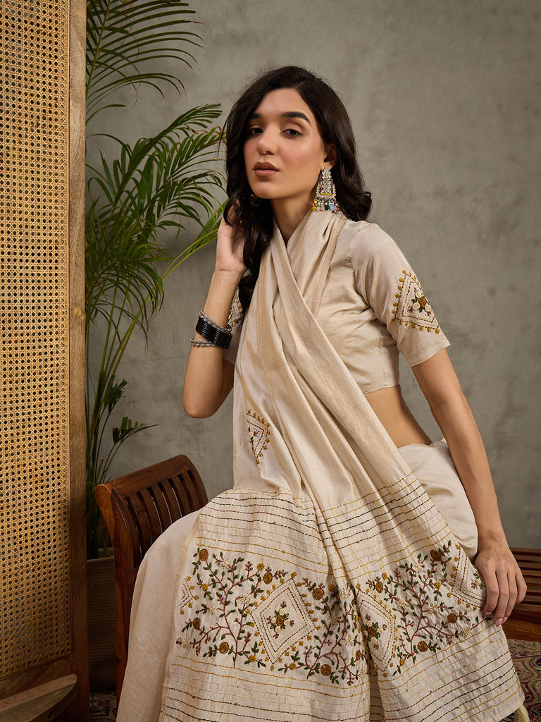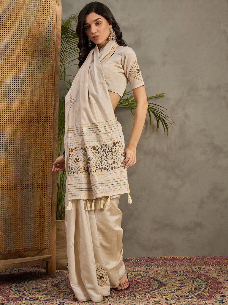 The Pakhi Saree in Tussar silk is delicately embroidered with buti motifs and features tassels on the pallu. Its understated elegance makes it ideal for daily wear and small gatherings.