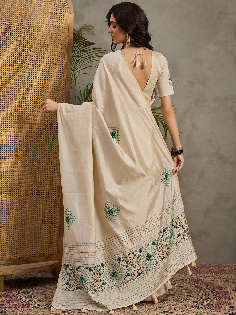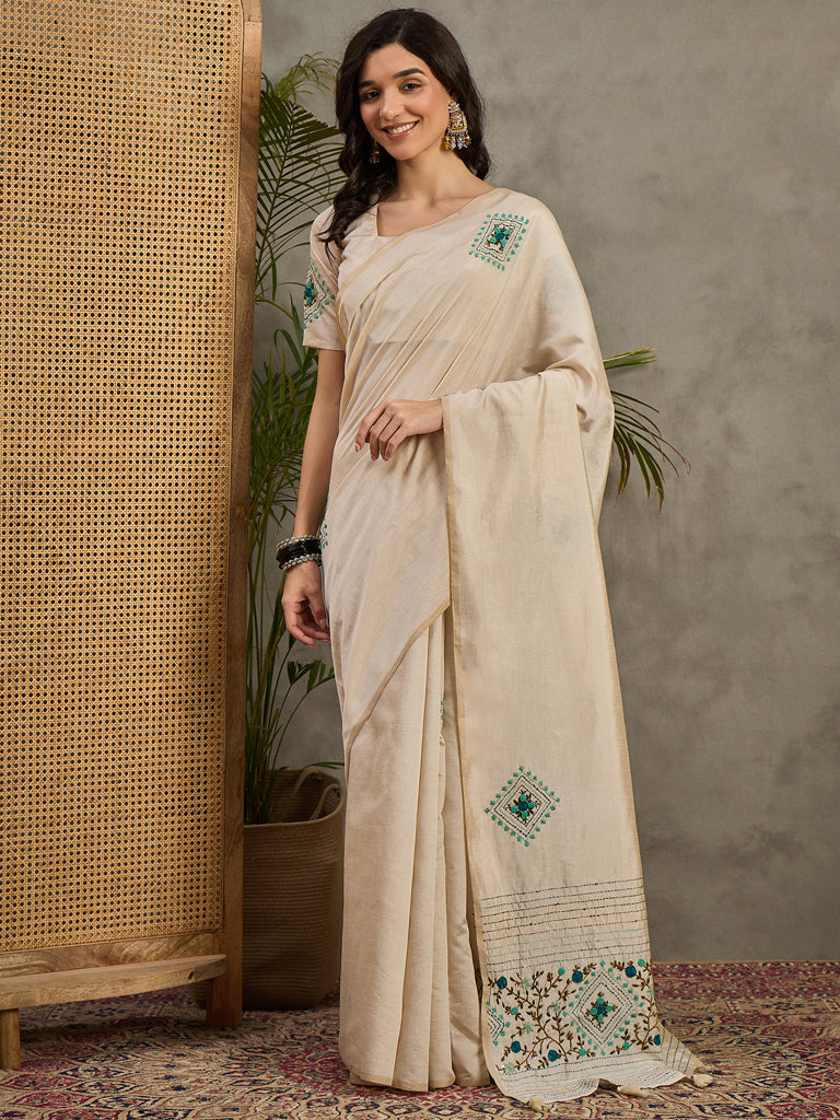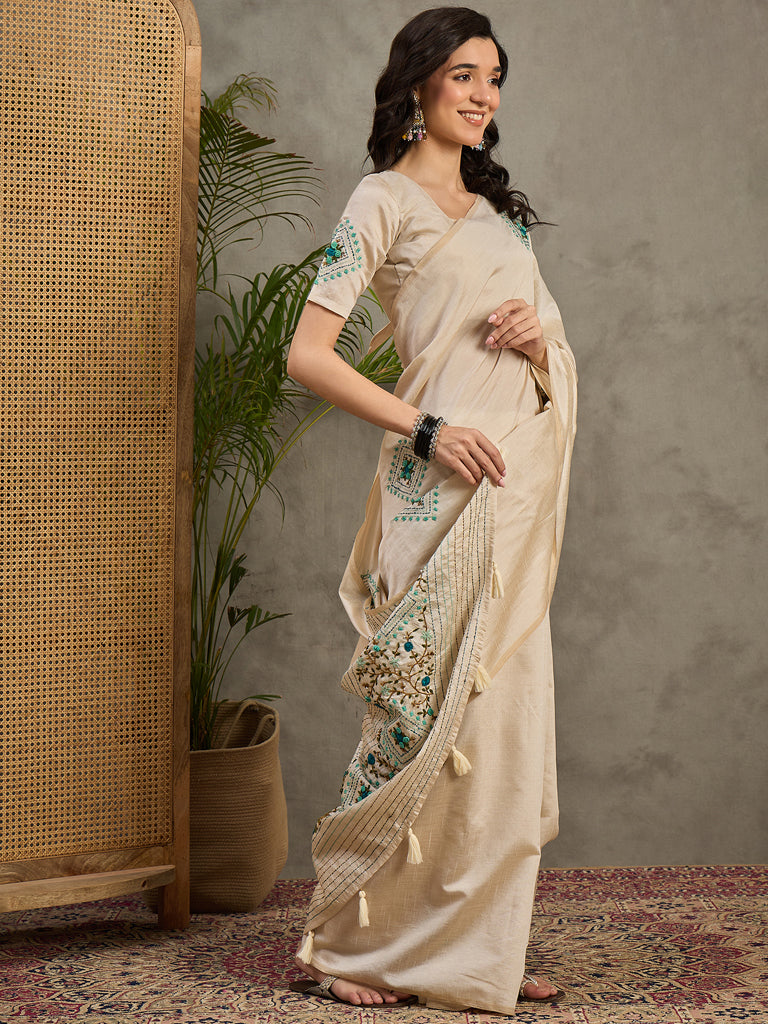 The Pakhi Saree in Tussar silk is delicately embroidered with buti motifs and features tassels on the pallu. Its understated elegance makes it ideal for daily wear and small gatherings.