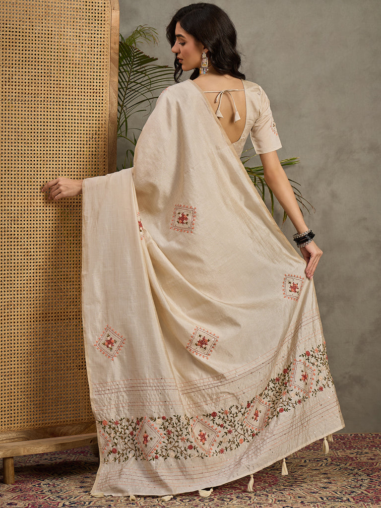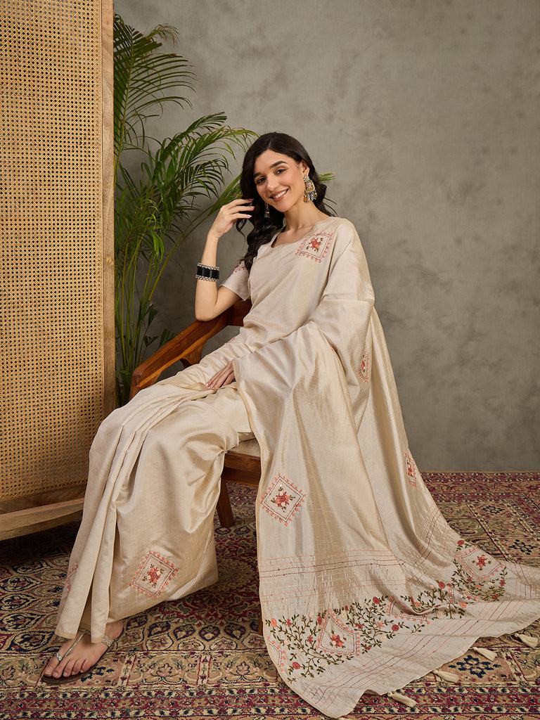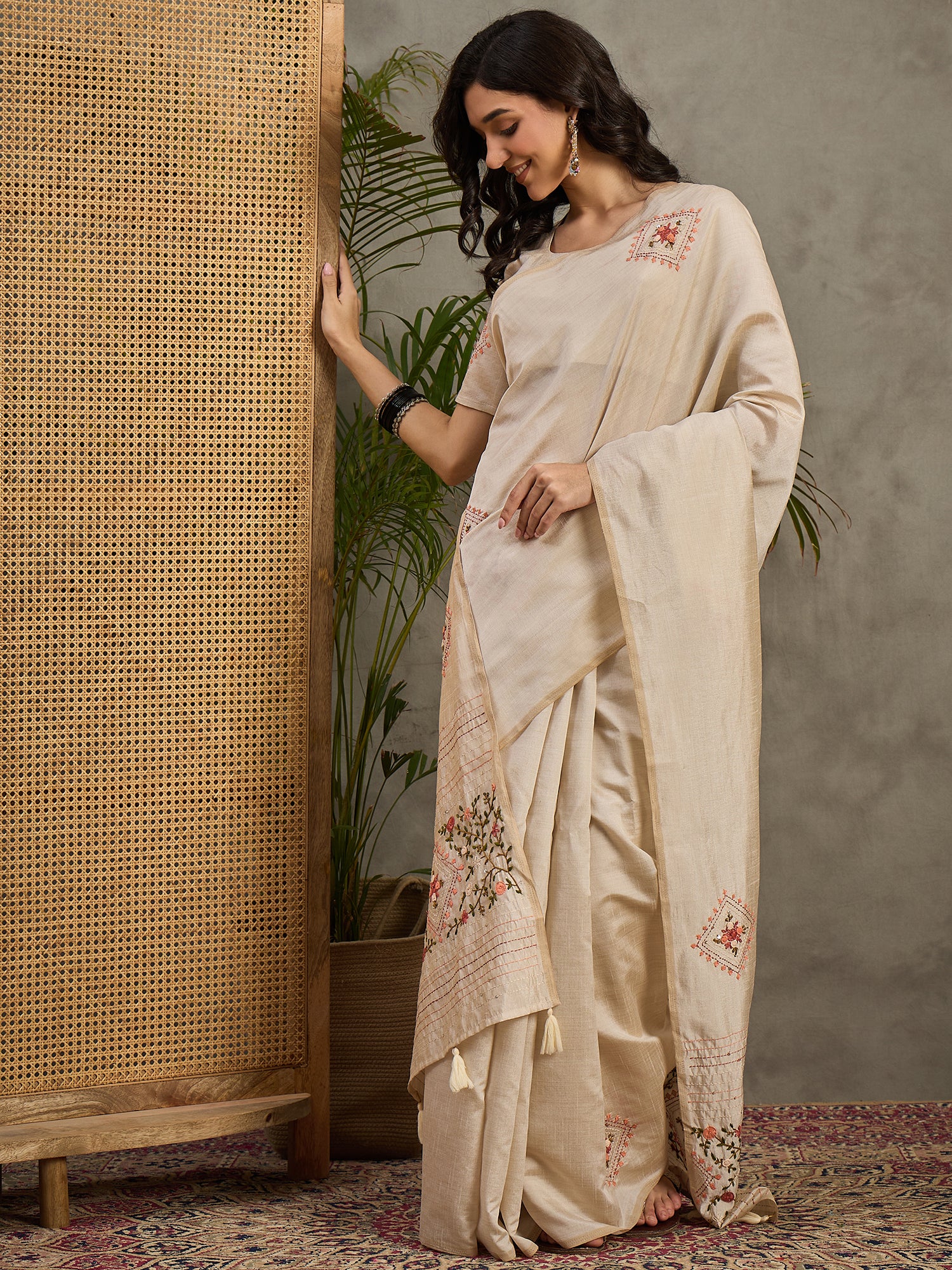 The Pakhi Saree in Tussar silk is delicately embroidered with buti motifs and features tassels on the pallu. Its understated elegance makes it ideal for daily wear and small gatherings.