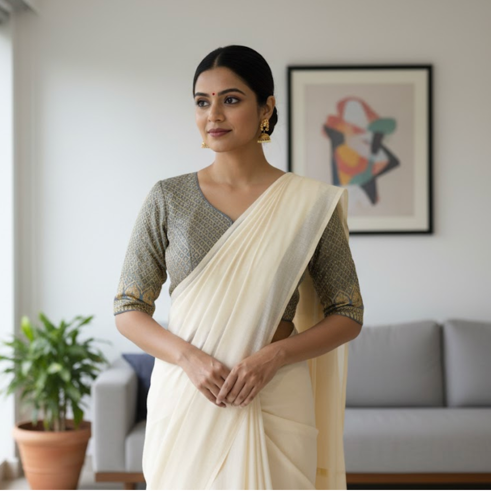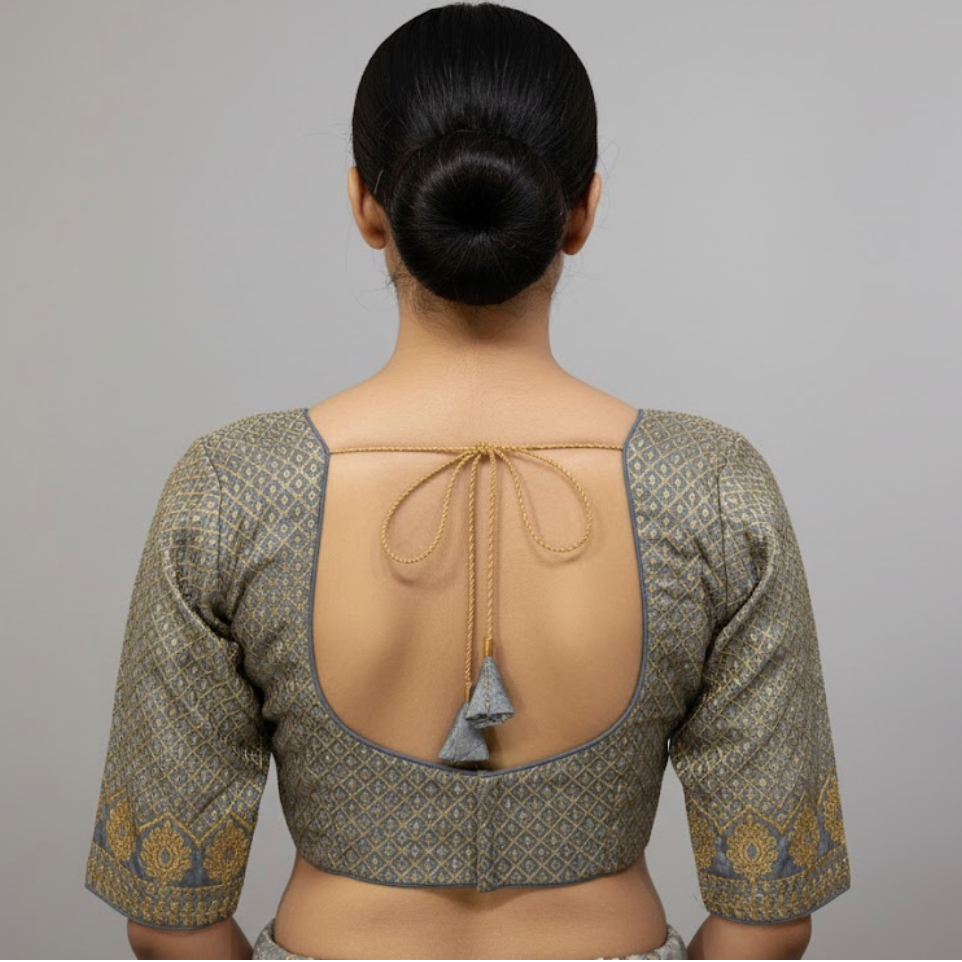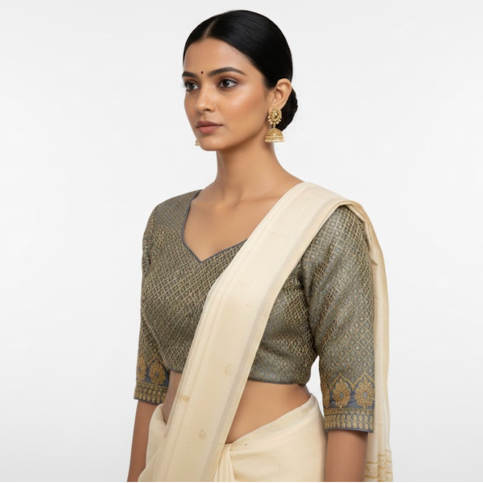 The Ekaa Blouse brings a brocade-look charm with its beautifully textured embroidered finish. The half sleeves and rich sheen make it perfect for festive events and wedding functions, adding instant grace to any saree.