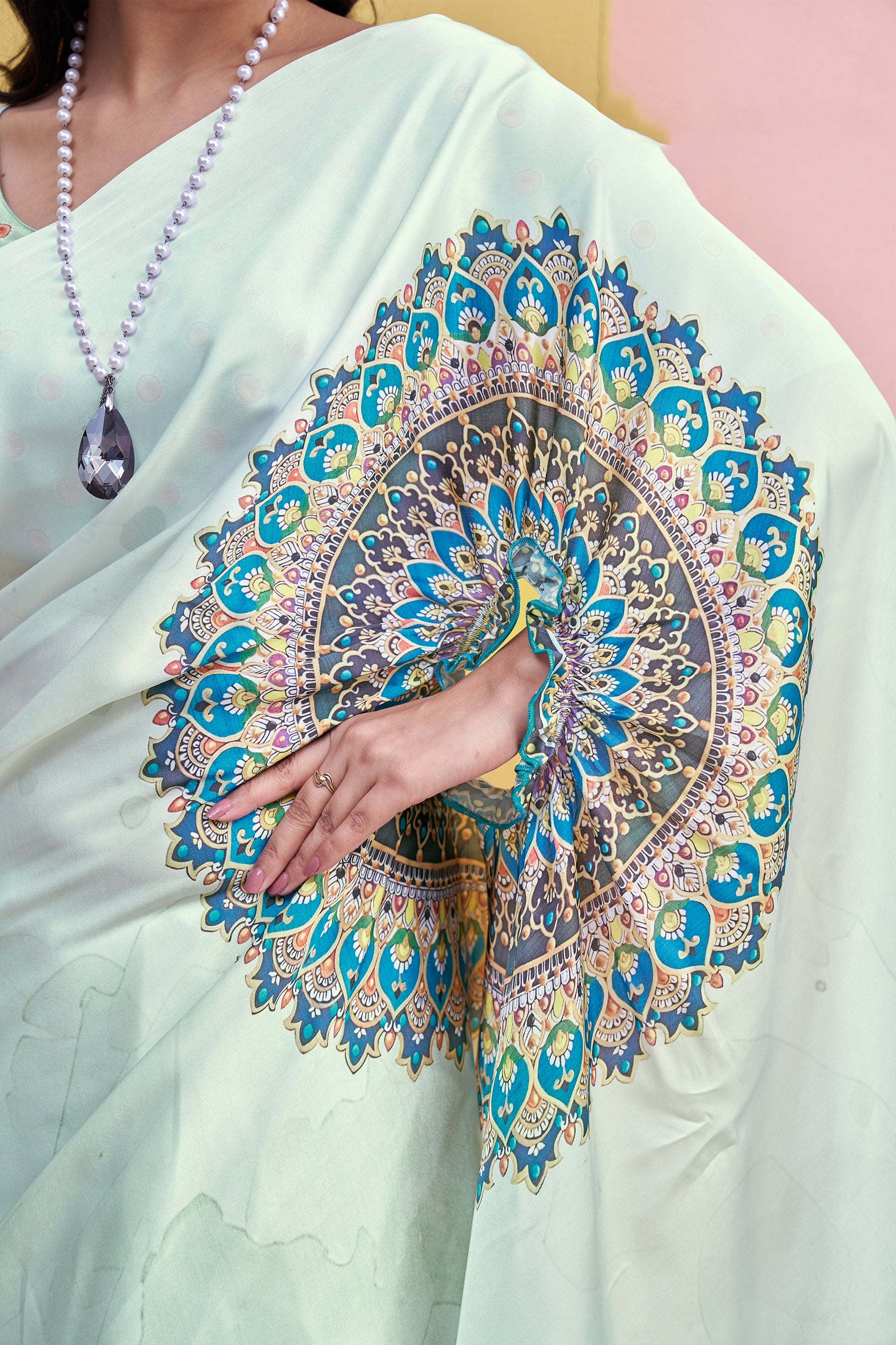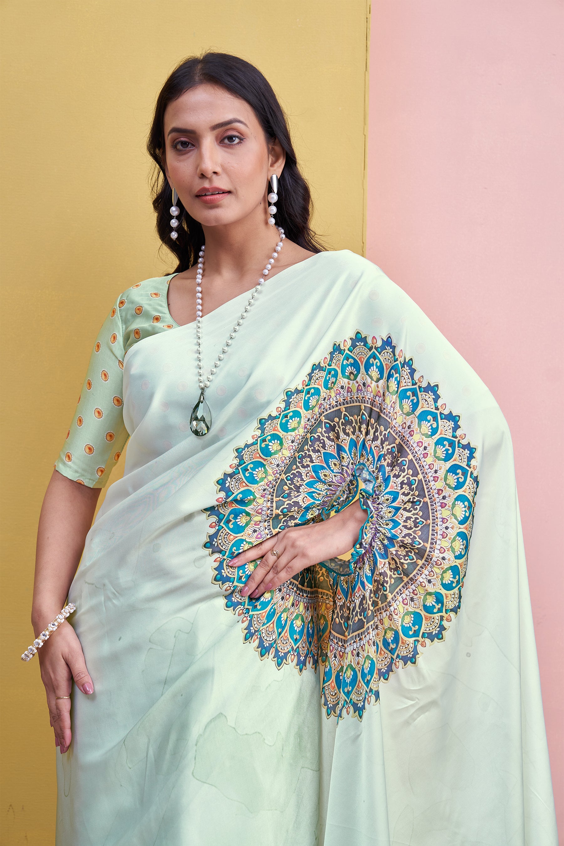 The Flora Saree in satin georgette exudes freshness with its bold floral motifs on the pallu. This contemporary drape combines comfort and sophistication, making it ideal for day wear or semi-formal outings.