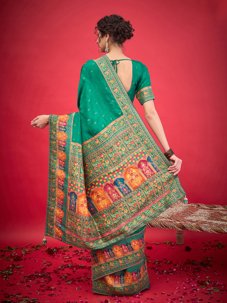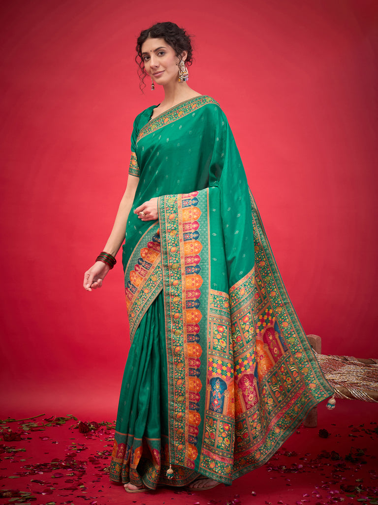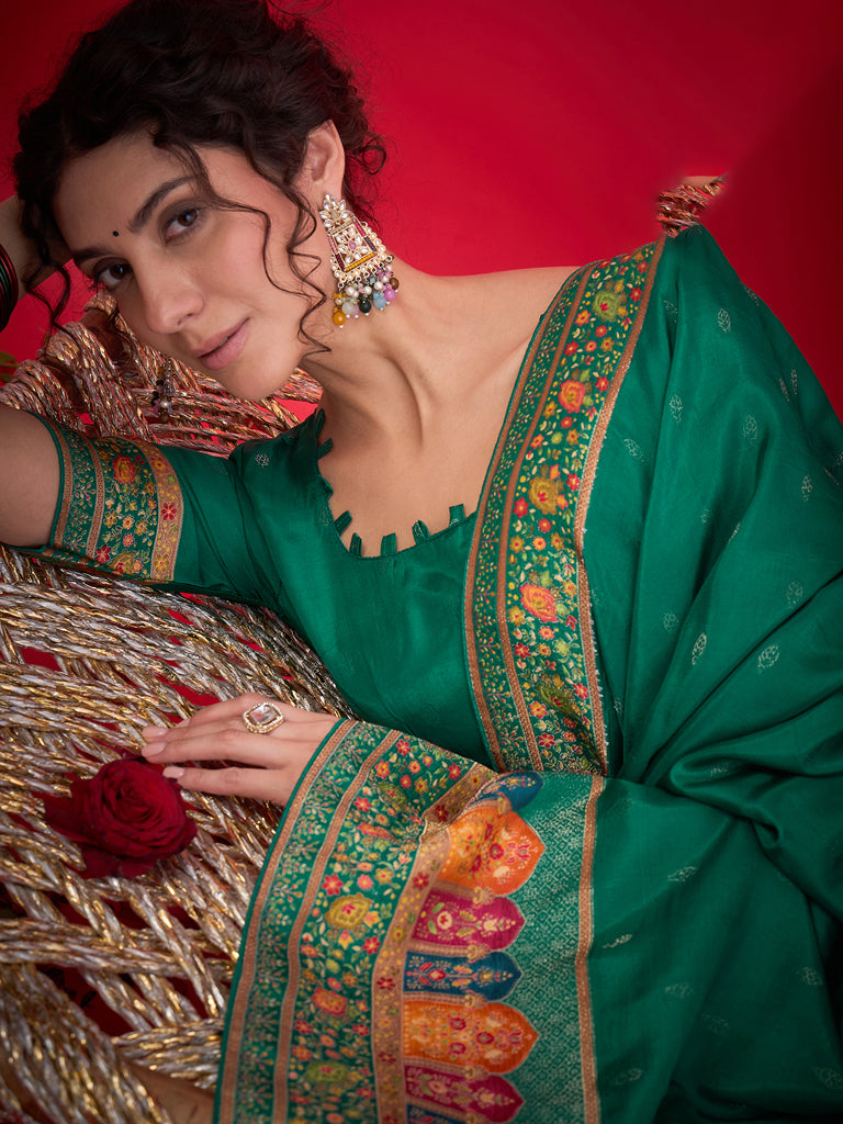 The Mastani Saree in pure Dola viscose features delicate buti motifs with a contrasting border and a vibrant, colorful pallu. Its luxurious sheen and lightweight fabric make it perfect for festive gatherings or wedding celebrations.