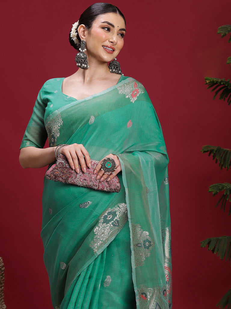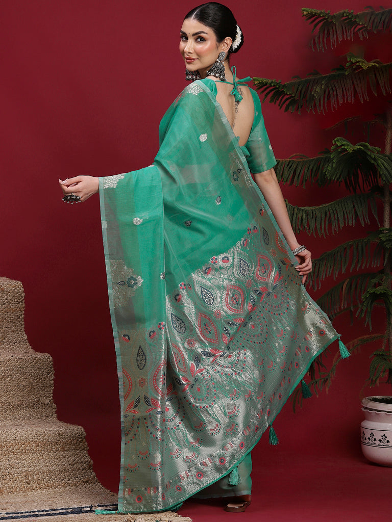 Elegant and sophisticated, the Raha Saree is woven in Linen Jacquard with heavy zari work on the pallu, making it a standout festive choice. It blends the richness of tradition with the lightness of linen for an effortlessly graceful look.