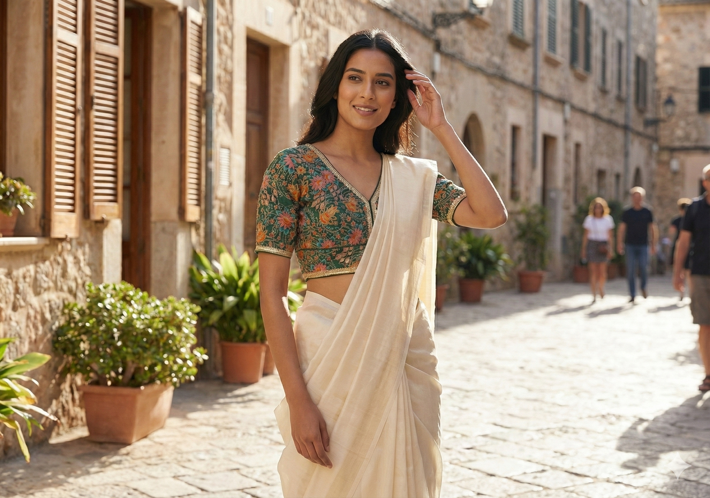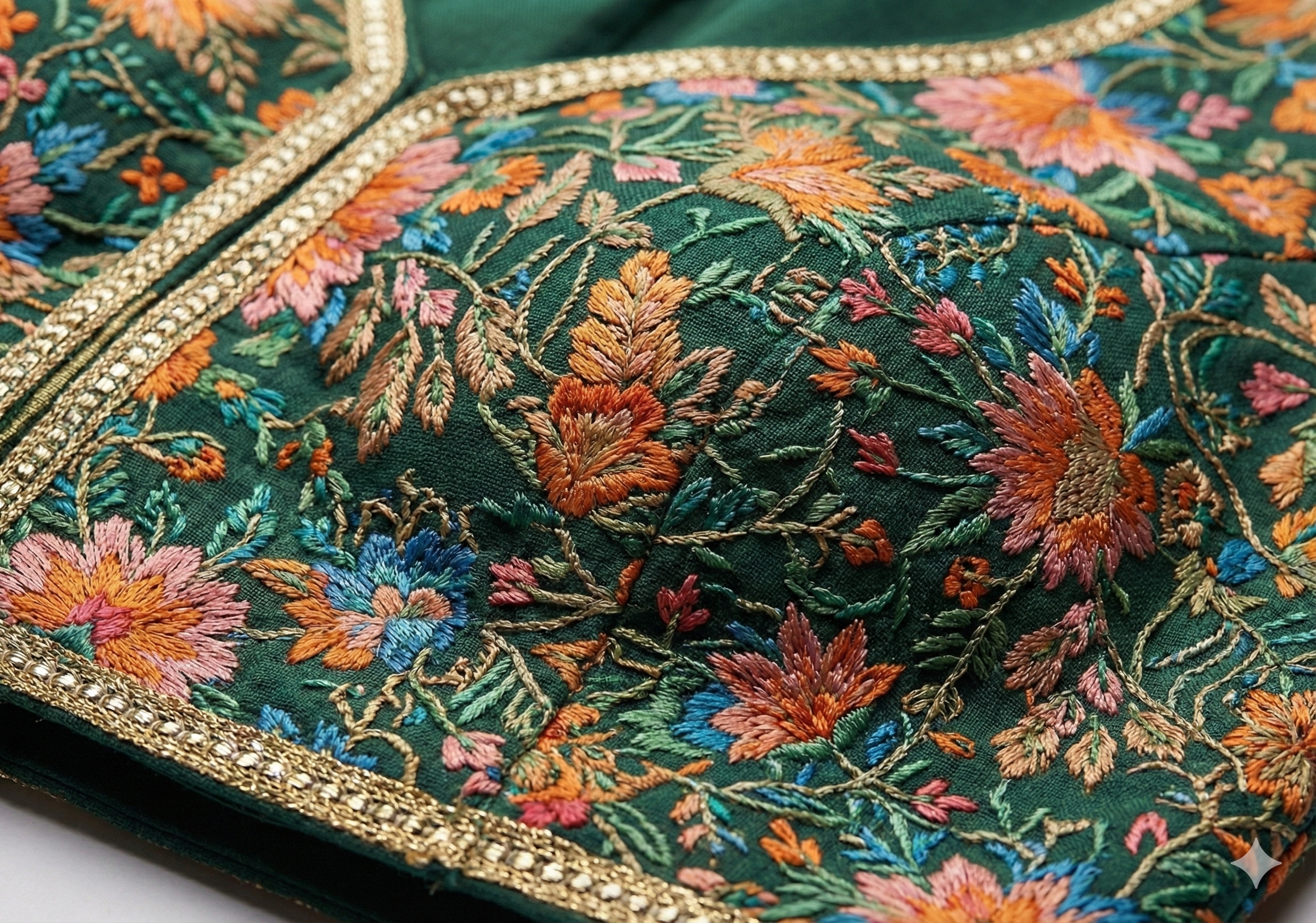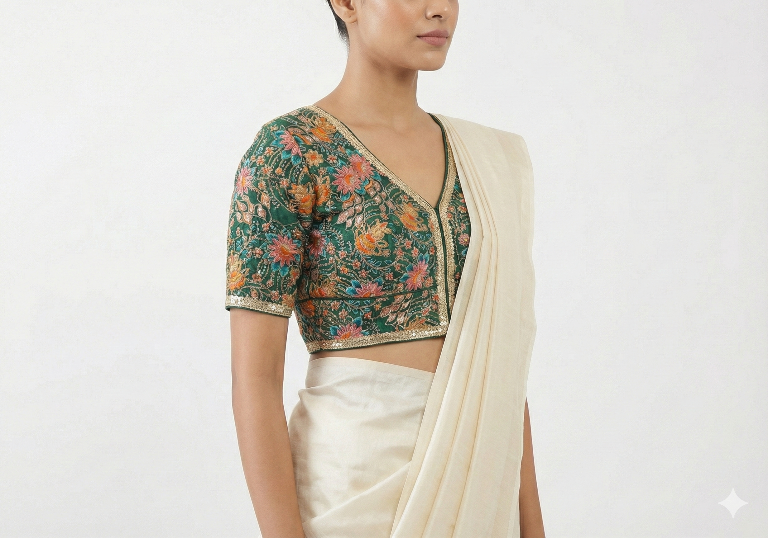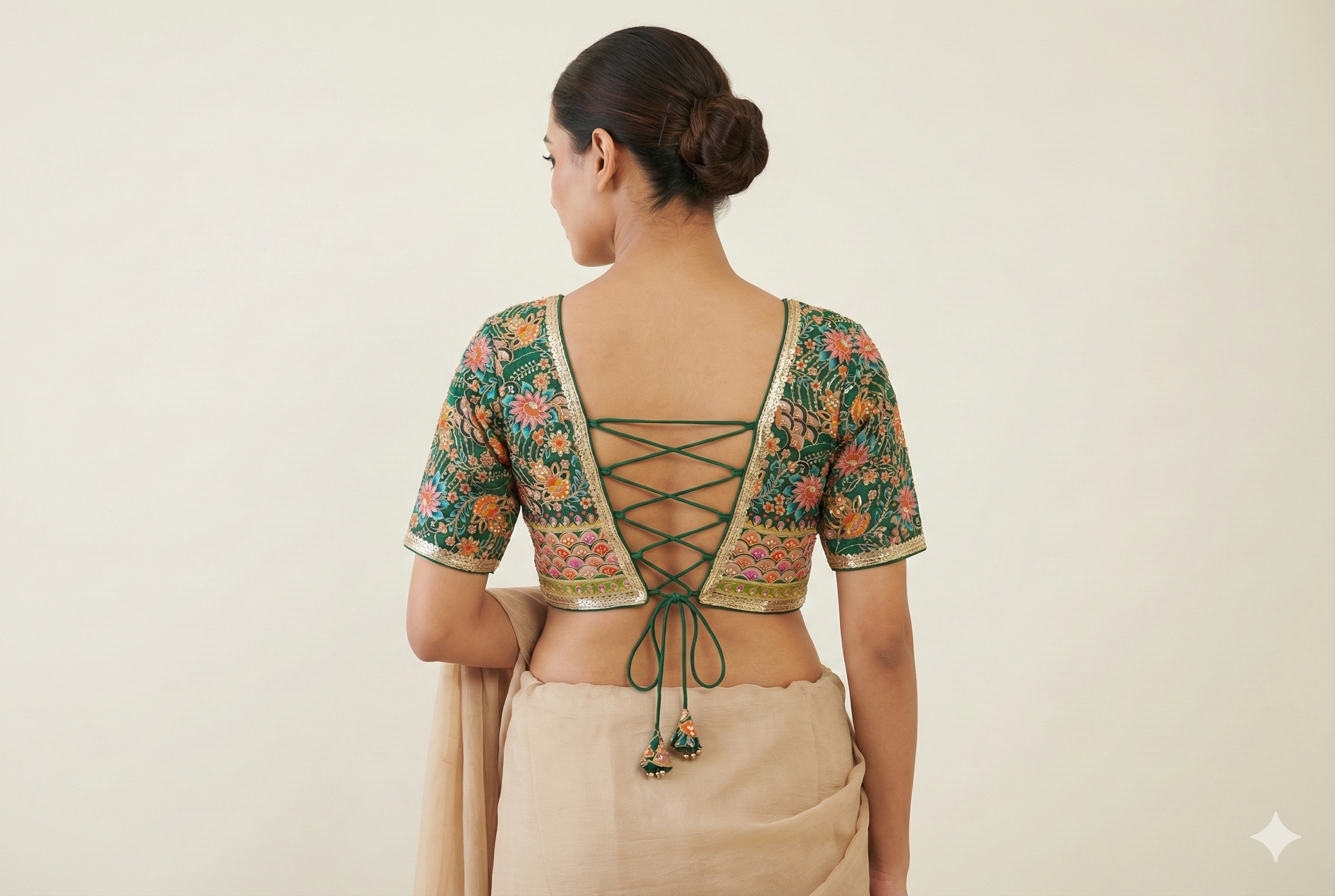 Note: This blouse comes in free size. We do not provide alterations, but an ample margin inside allows resizing as needed.