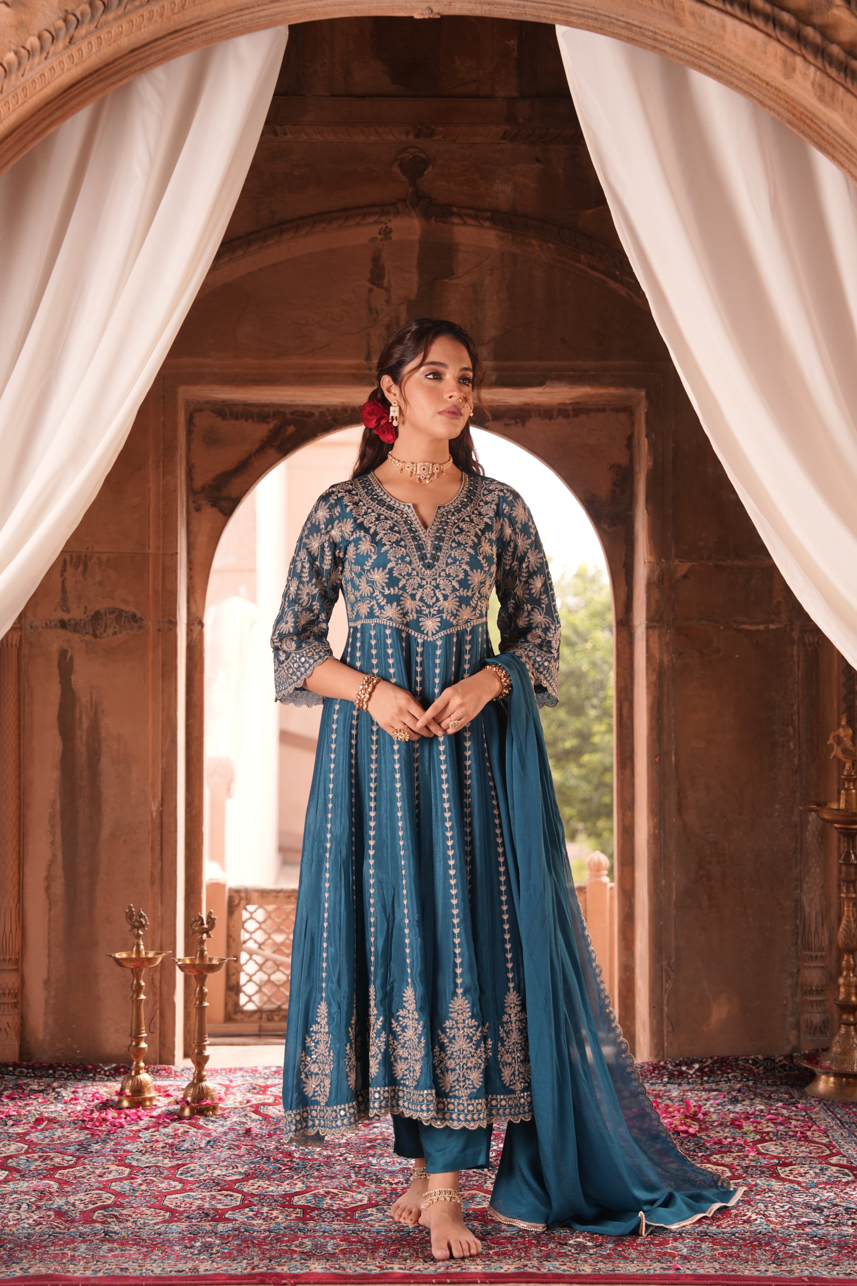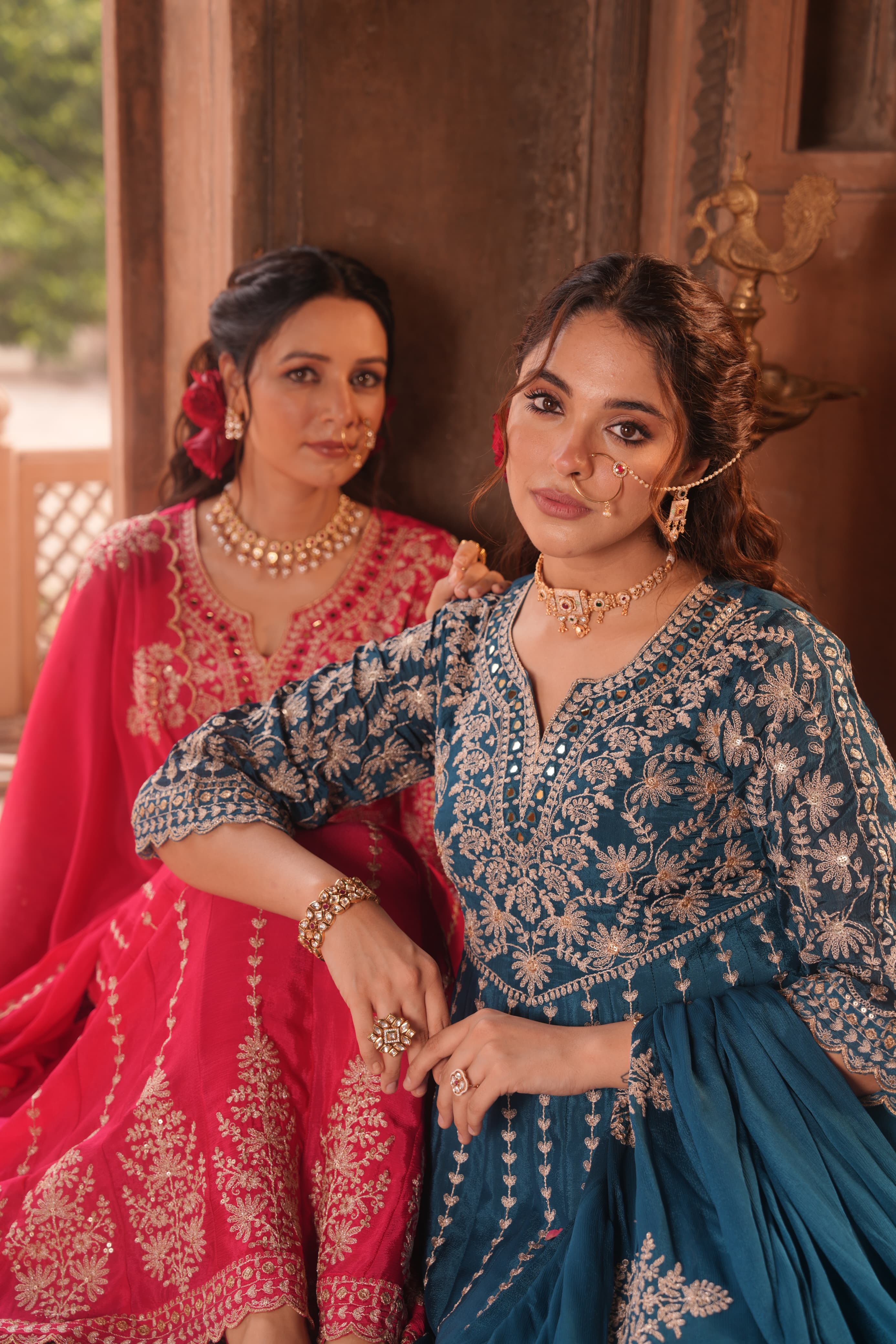 True to its name, the Lakshmi Suit Set is a symbol of festive grandeur. The heavily embroidered kurta paired with an embroidered dupatta makes it a regal ensemble for Diwali, Karwa Chauth, or weddings.