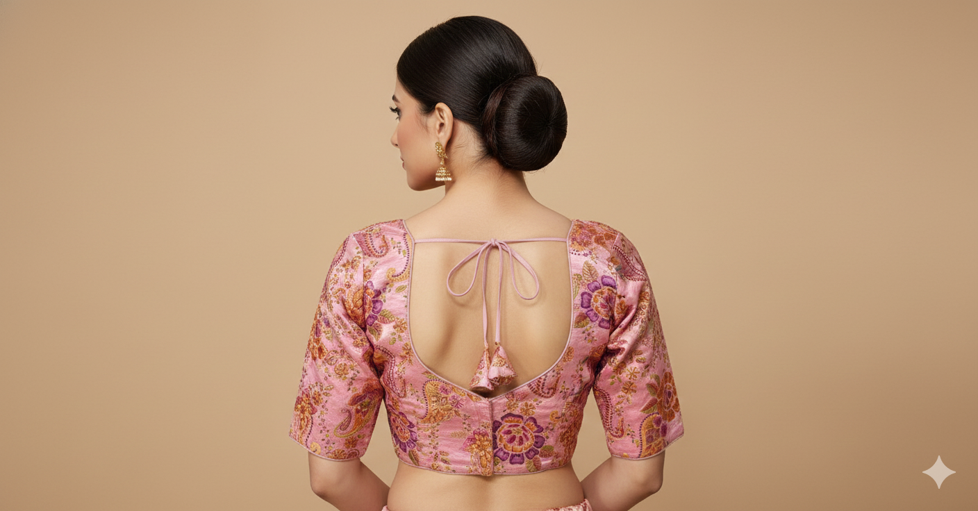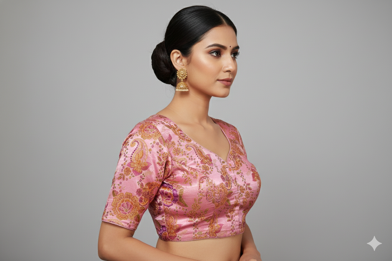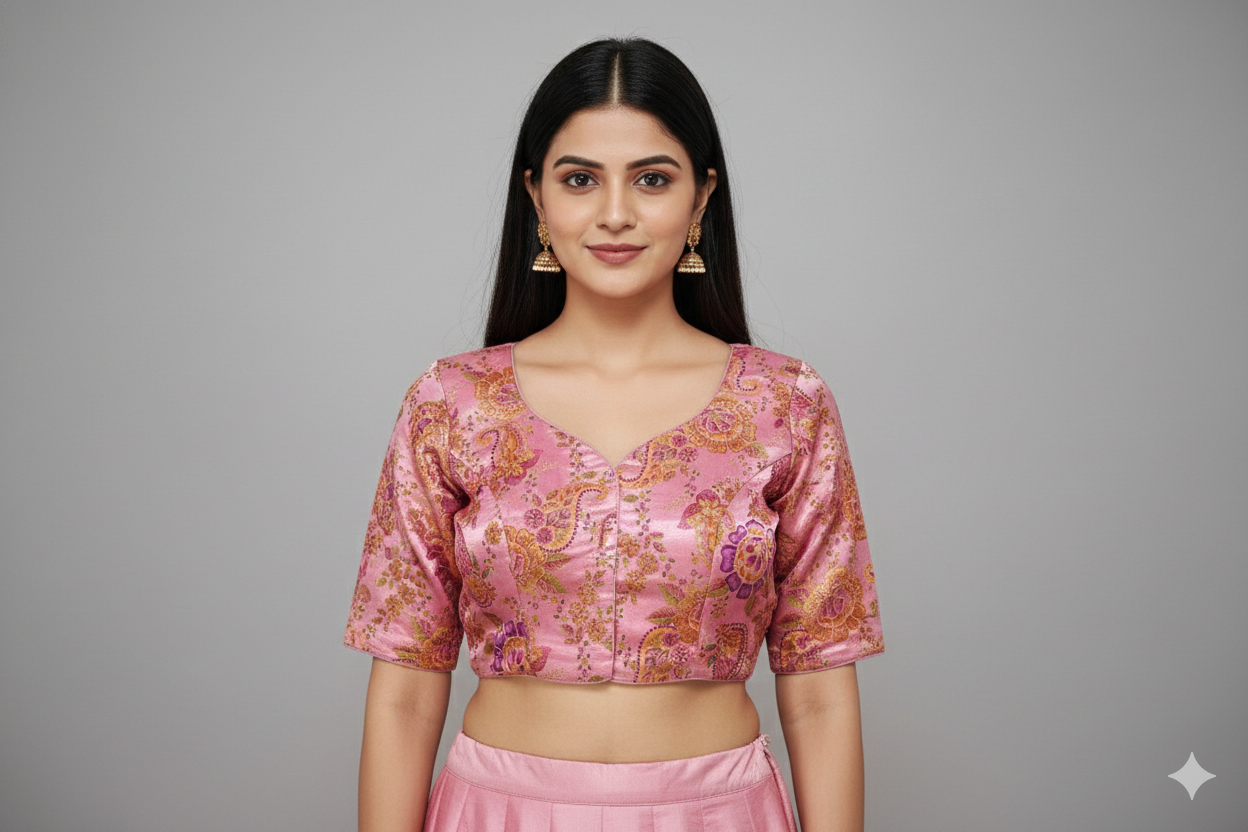 Elegant and easy to style, the Charita Blouse in cotton satin features half sleeves, a back opening with dori tassel, and padded comfort. The all-over printed design makes it versatile enough to pair with both solid and patterned sarees for a graceful day look.
