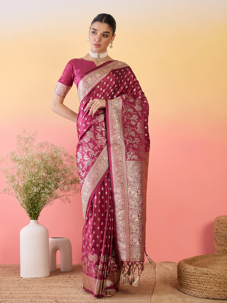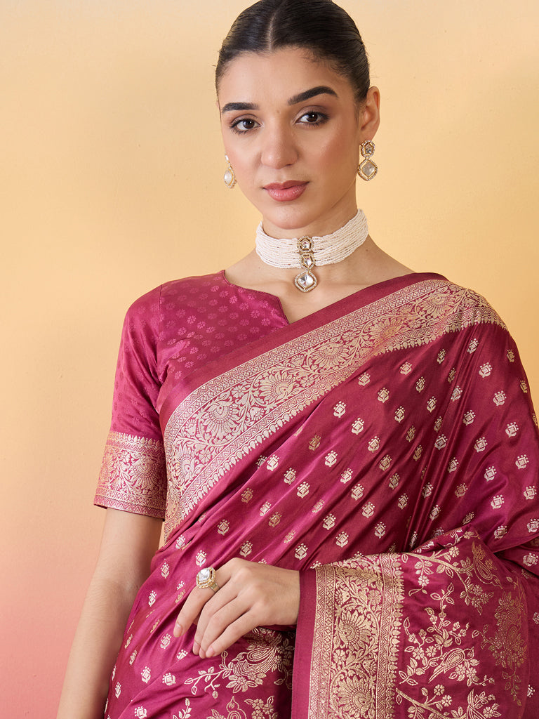 The Vaati Saree in pure satin silk exudes royal elegance with its Banarasi-style jaal and buti weaving. The soft satin finish adds a regal sheen, making it perfect for festive and wedding occasions.