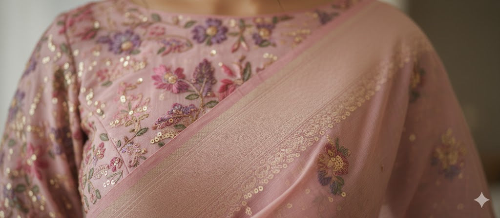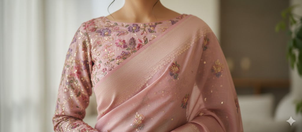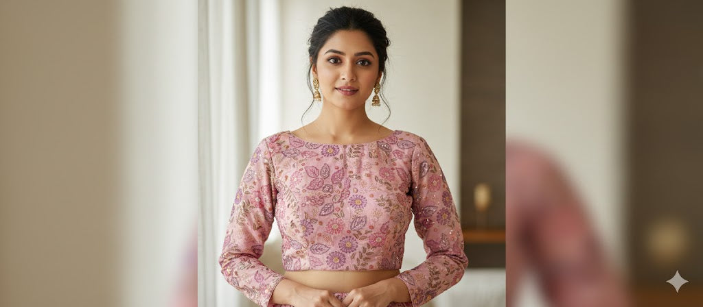 Delicate and dreamy, the Samaira Blouse is crafted in organza fabric with small floral embroidery all over. The full sleeves, padded comfort, and dori tassel at back make it a statement blouse for festive and wedding wear.