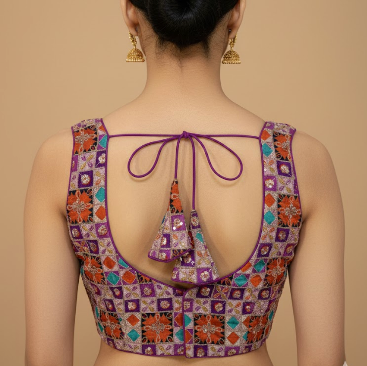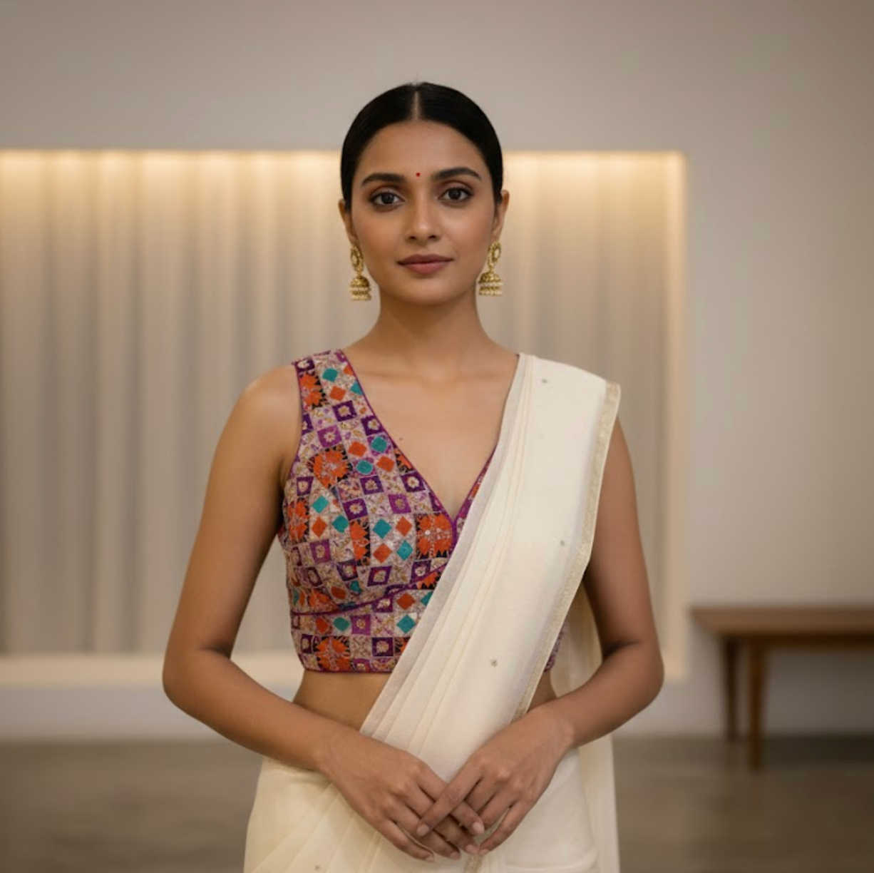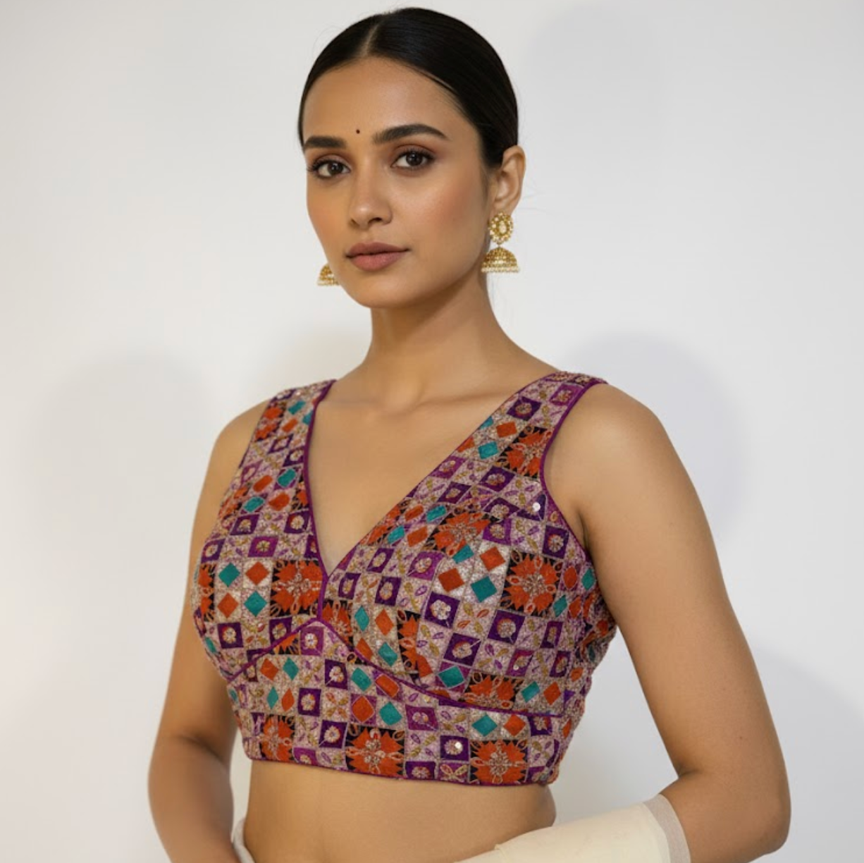 The Binita Blouse is a vibrant, multicolor embroidered piece designed to elevate any saree look. With its rich detailing and versatile palette, it pairs beautifully with a wide range of printed and solid sarees, making it ideal for festive moments and special gatherings.