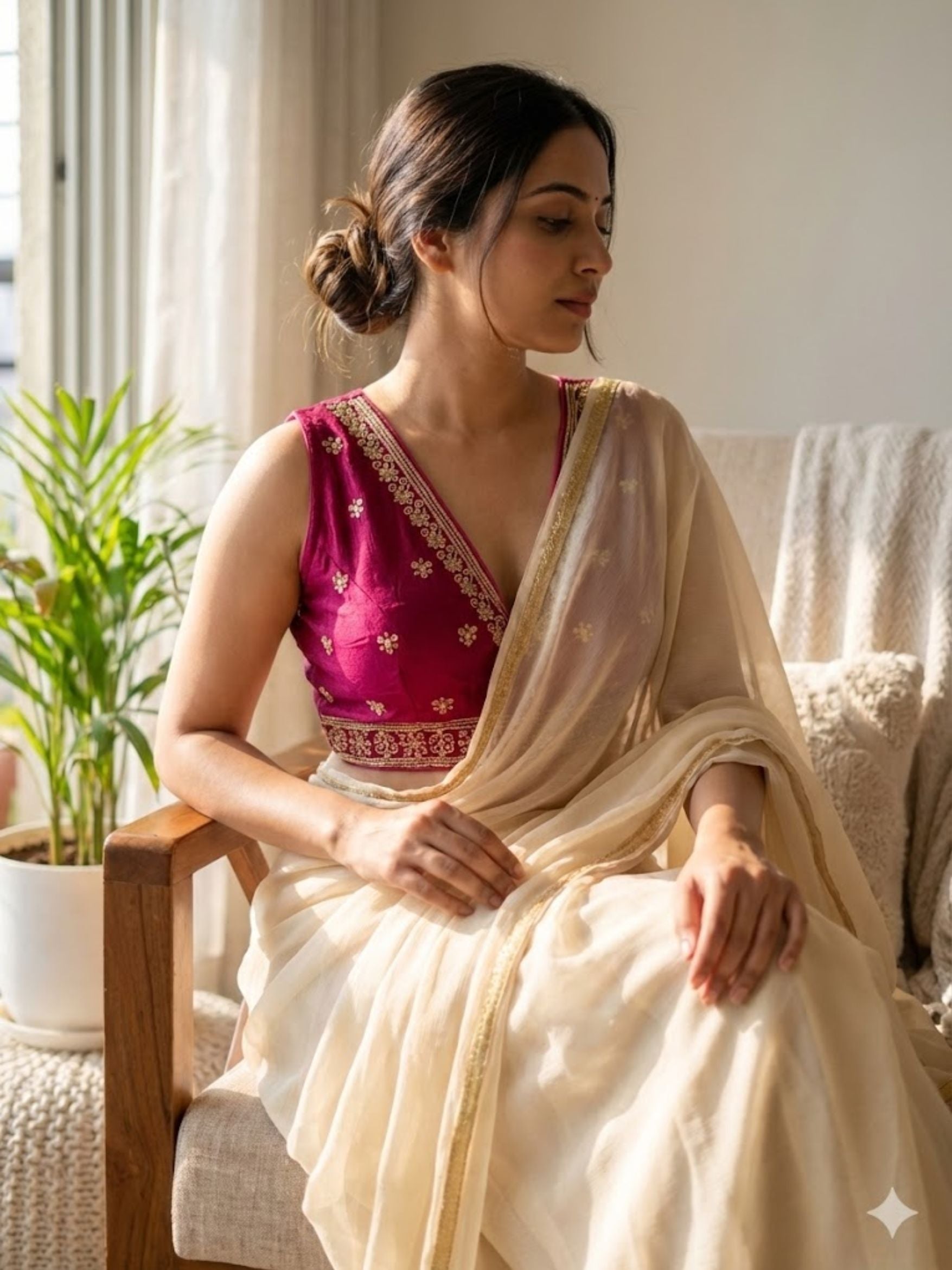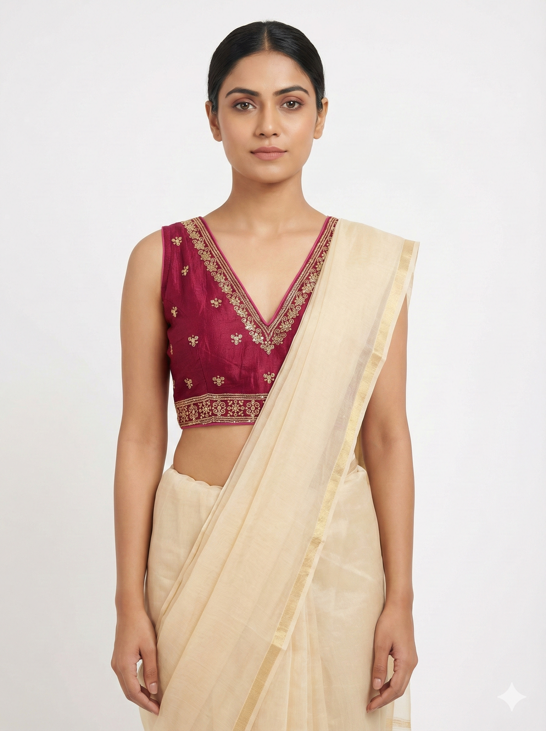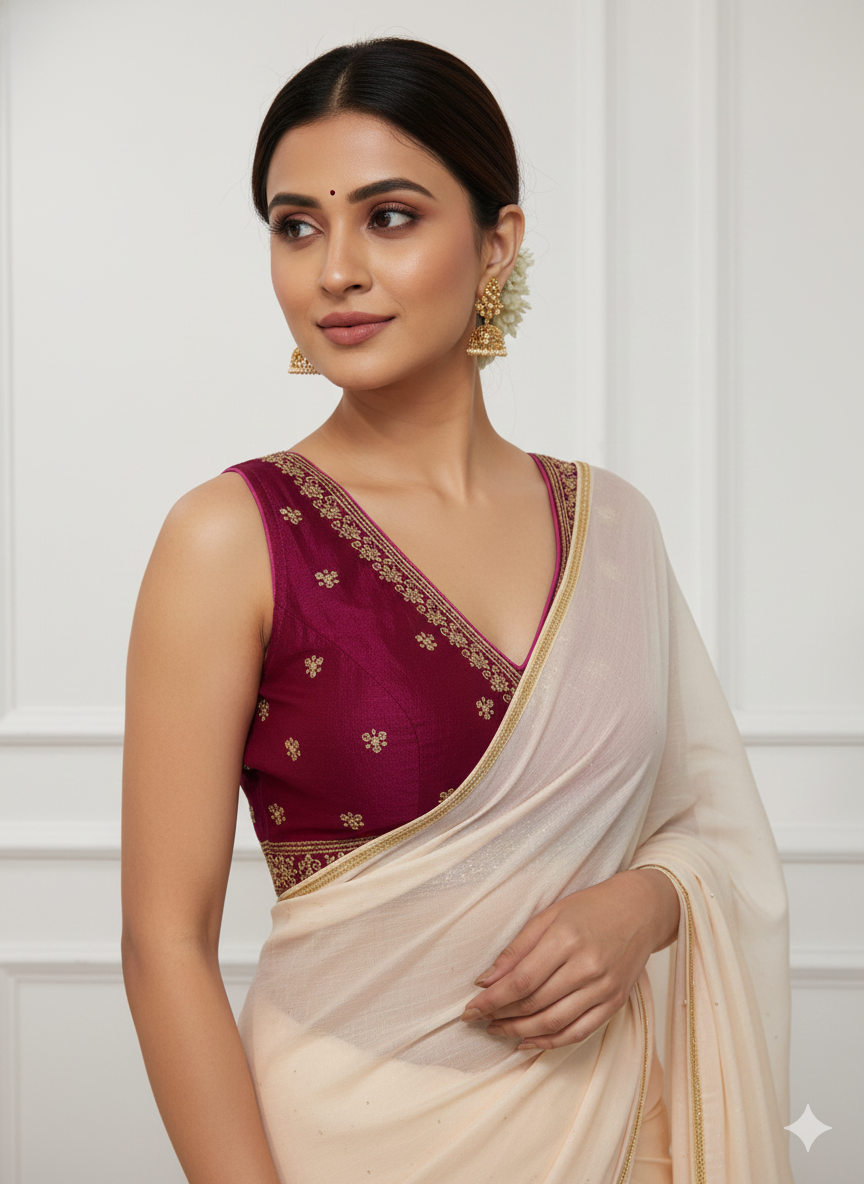 The Radha Blouse brings understated elegance with its delicate embroidery on the neckline and waist band. Crafted in cotton satin, this piece features cut sleeves with attachable half sleeves and padded comfort, making it a versatile choice that pairs beautifully with both traditional and contemporary sarees.