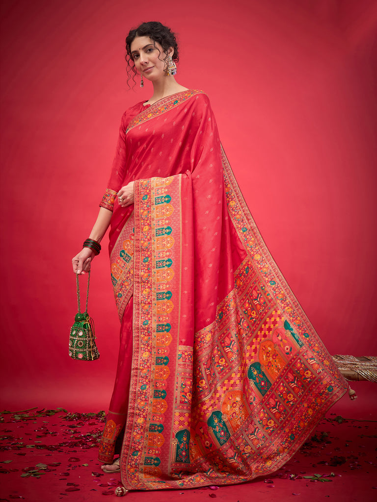 The Mastani Saree in pure Dola viscose features delicate buti motifs with a contrasting border and a vibrant, colorful pallu. Its luxurious sheen and lightweight fabric make it perfect for festive gatherings or wedding celebrations.