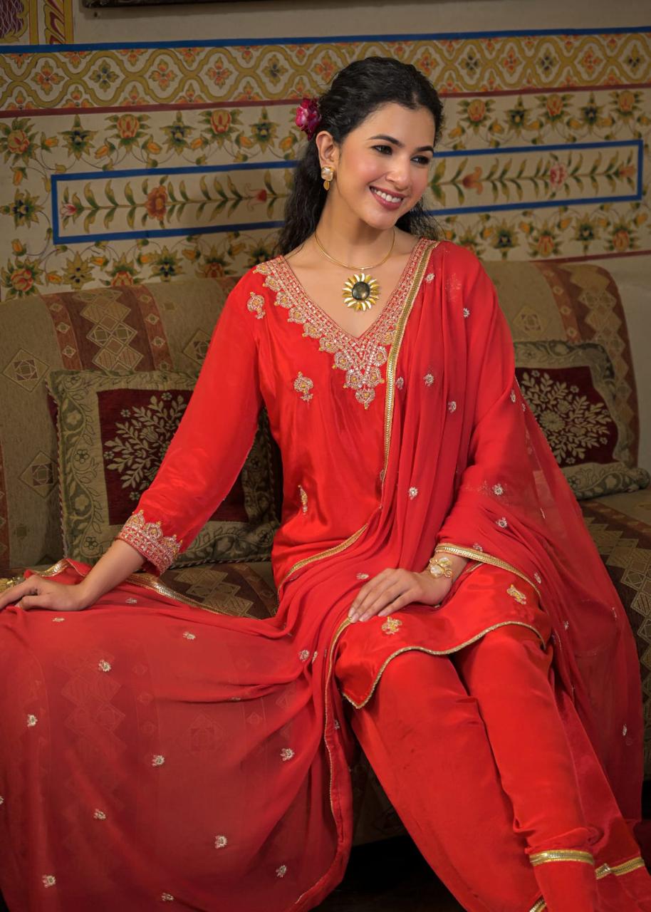 Celebrate timeless elegance with the Roop Suit Set, crafted with a beautifully embroidered neckline that adds a touch of festive grace. Paired with classic salwar-pattern pants and a matching dupatta, this 3-piece set is designed to make you look effortlessly radiant at any festival or celebration.