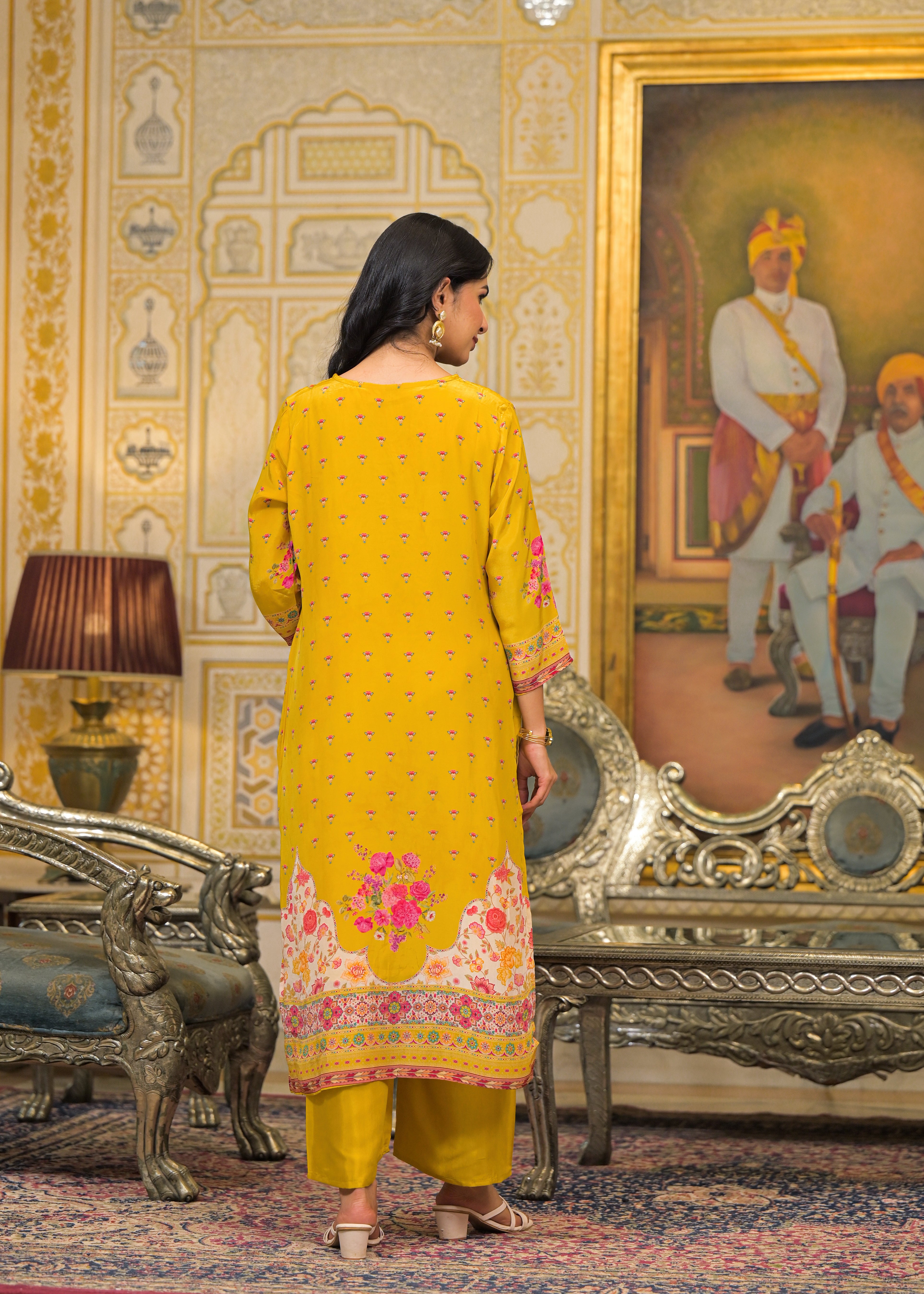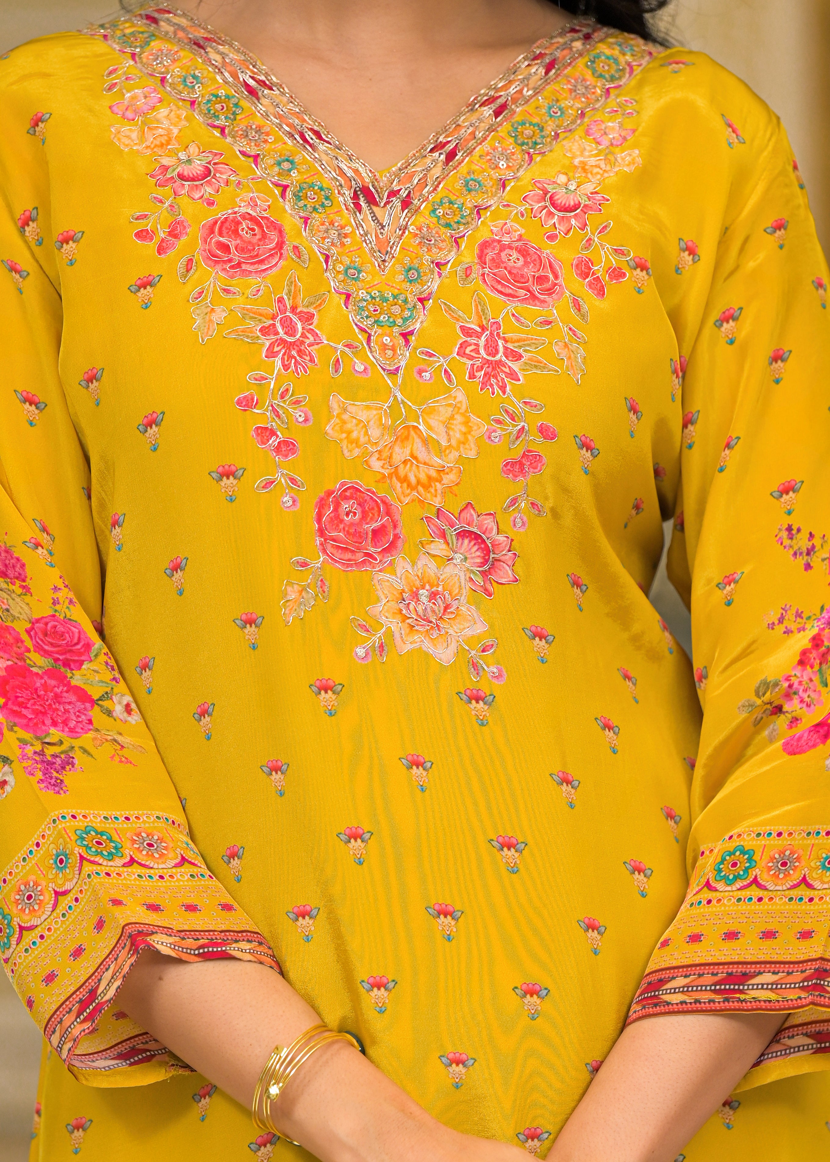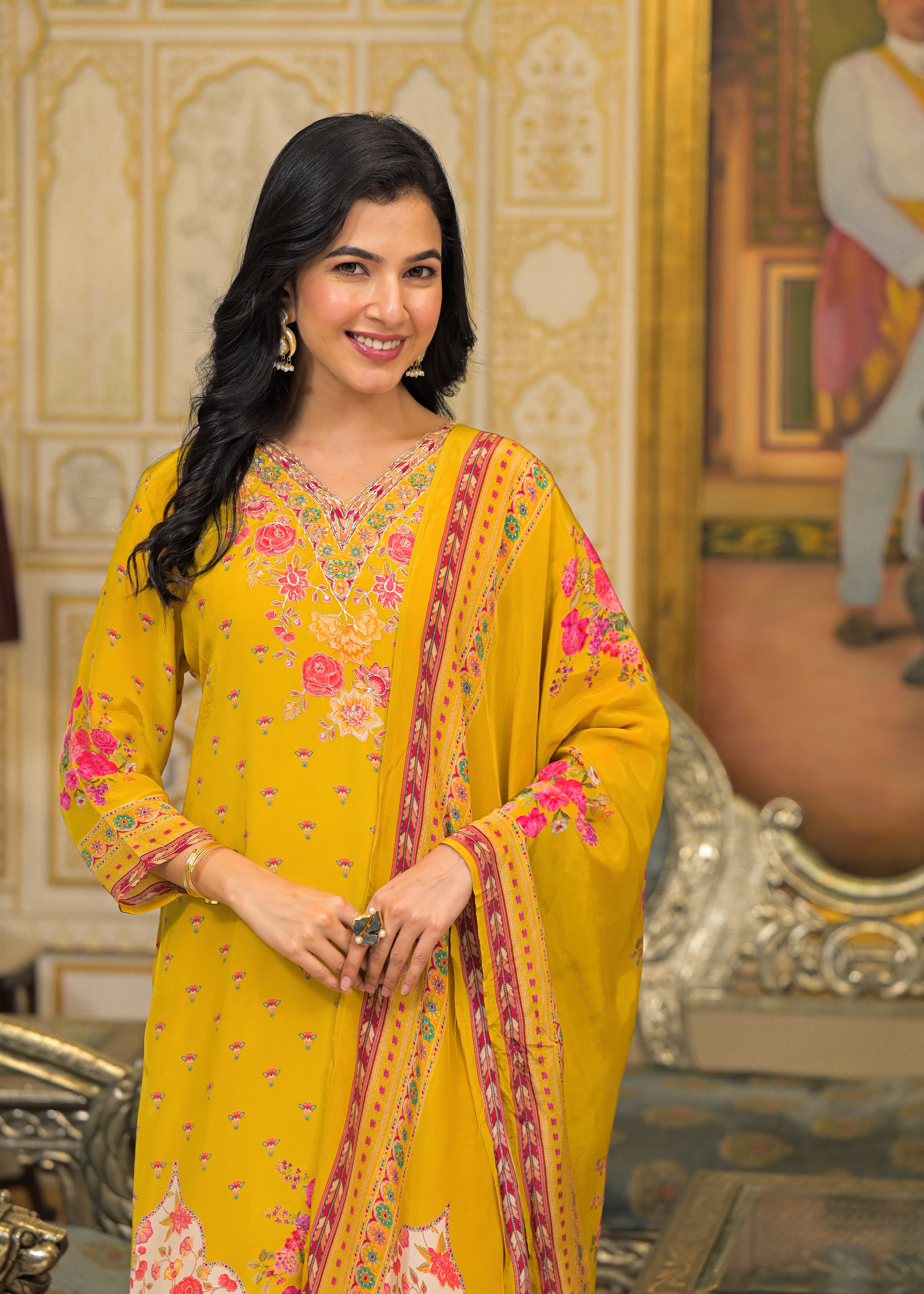 Bring alive the festive spirit with the Roshni Suit Set, designed in floral bright prints that radiate cheer. This vibrant 3-piece set includes a printed kurta, matching pants, and a coordinating printed dupatta—crafted to celebrate joy in style.