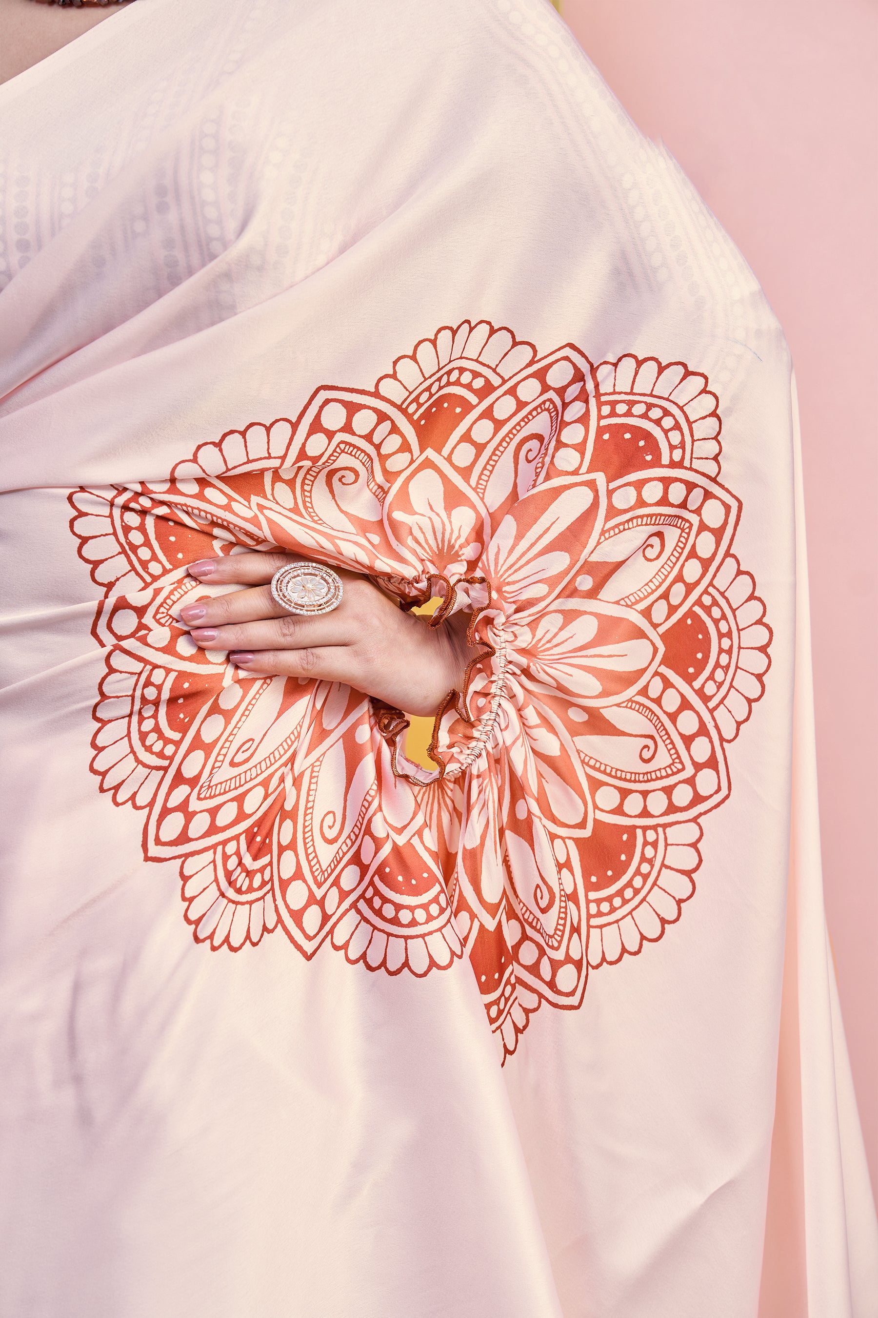 The Flora Saree in satin georgette exudes freshness with its bold floral motifs on the pallu. This contemporary drape combines comfort and sophistication, making it ideal for day wear or semi-formal outings.