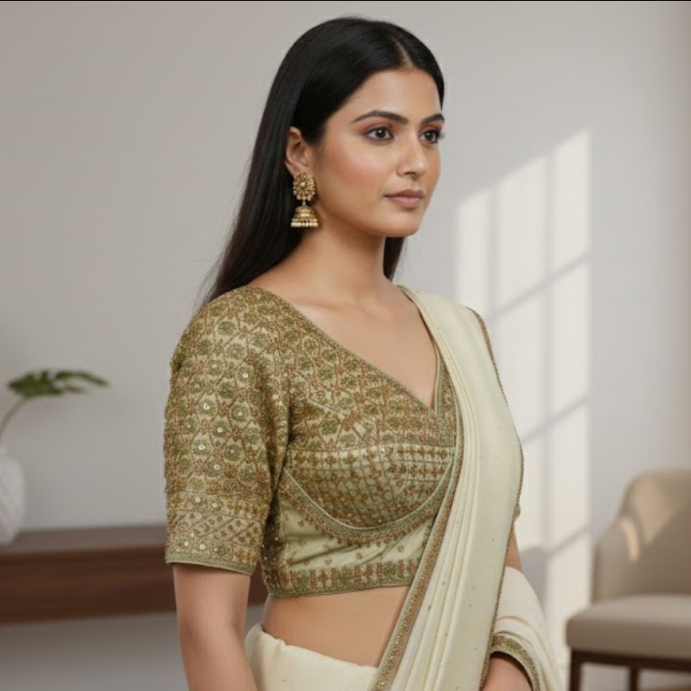 The Gunjika Blouse is a stunning, heavy-embroidered blouse crafted to stand out in every festive celebration. Its half sleeves and intricate detailing make it perfect for pairing with both simple and heavy sarees.
