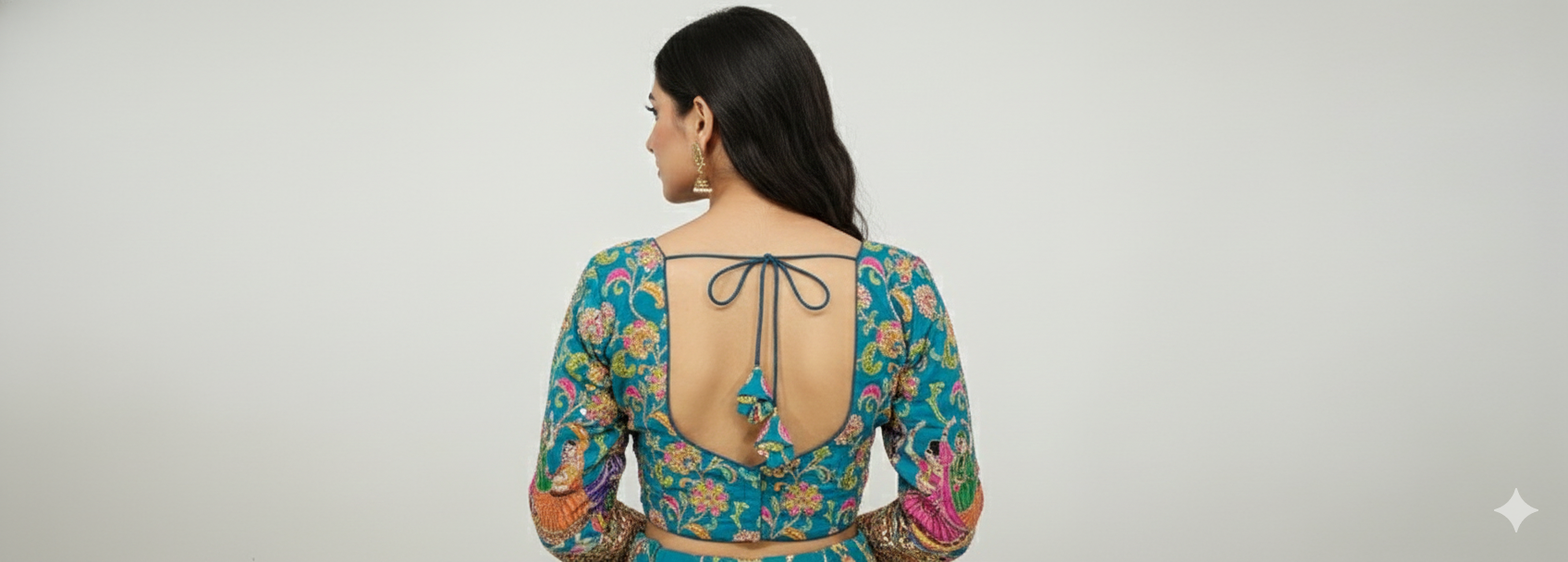 The Ishani Blouse in crepe viscose is a timeless piece featuring all-over floral embroidery with full sleeves and a back dori tassel. Elegant and richly textured, it’s an ideal match for wedding and festive sarees.