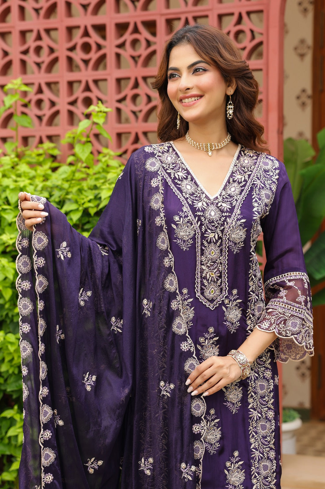 The Urvashi Suit Set is designed for women who love a fully embroidered look with a rich festive appeal. Paired with embroidered pants and a dupatta, it is a statement outfit for celebrations and special gatherings.