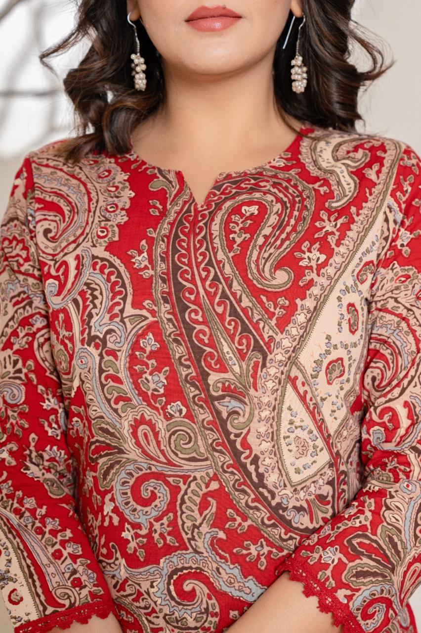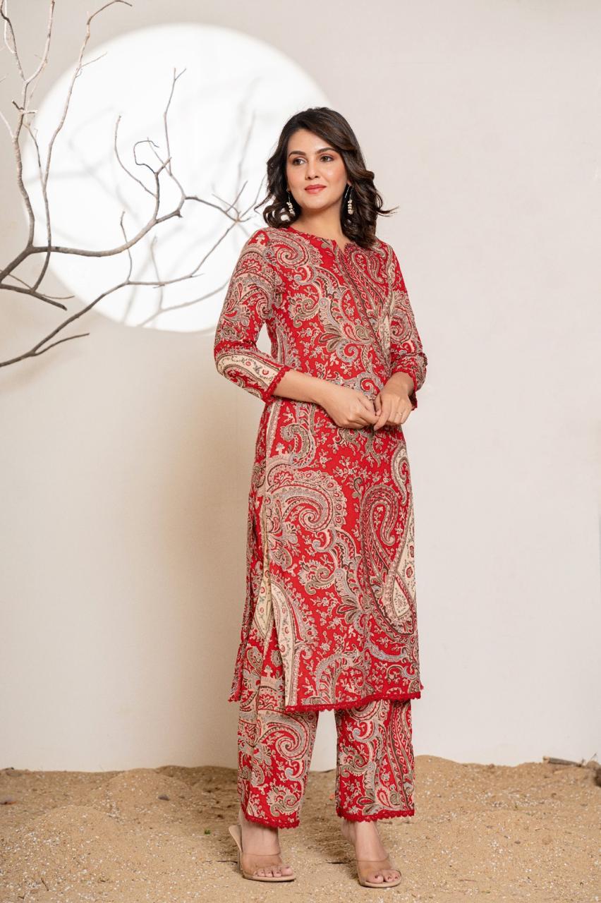Paired with a solid-coloured matching pant, this set offers easy styling and versatile wear—perfect for everyday grace or relaxed festive occasions.