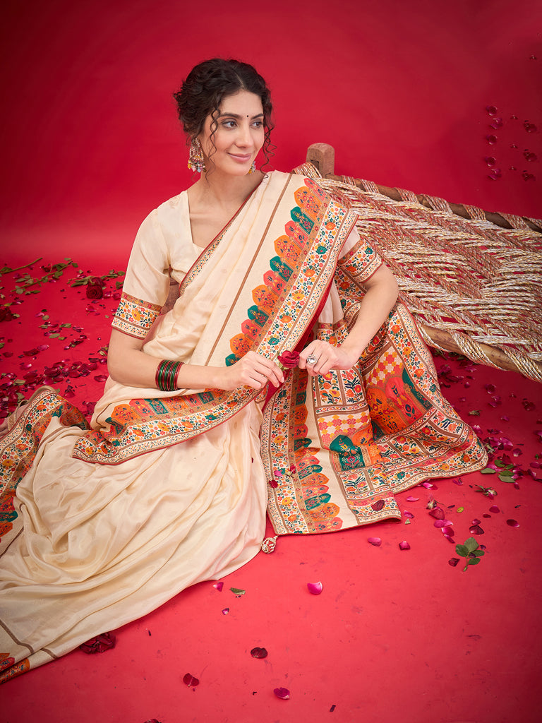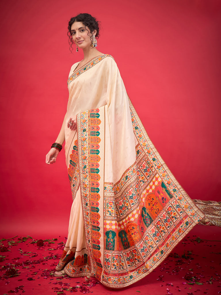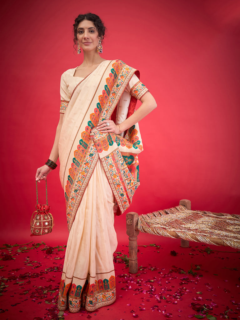 The Mastani Saree in pure Dola viscose features delicate buti motifs with a contrasting border and a vibrant, colorful pallu. Its luxurious sheen and lightweight fabric make it perfect for festive gatherings or wedding celebrations.