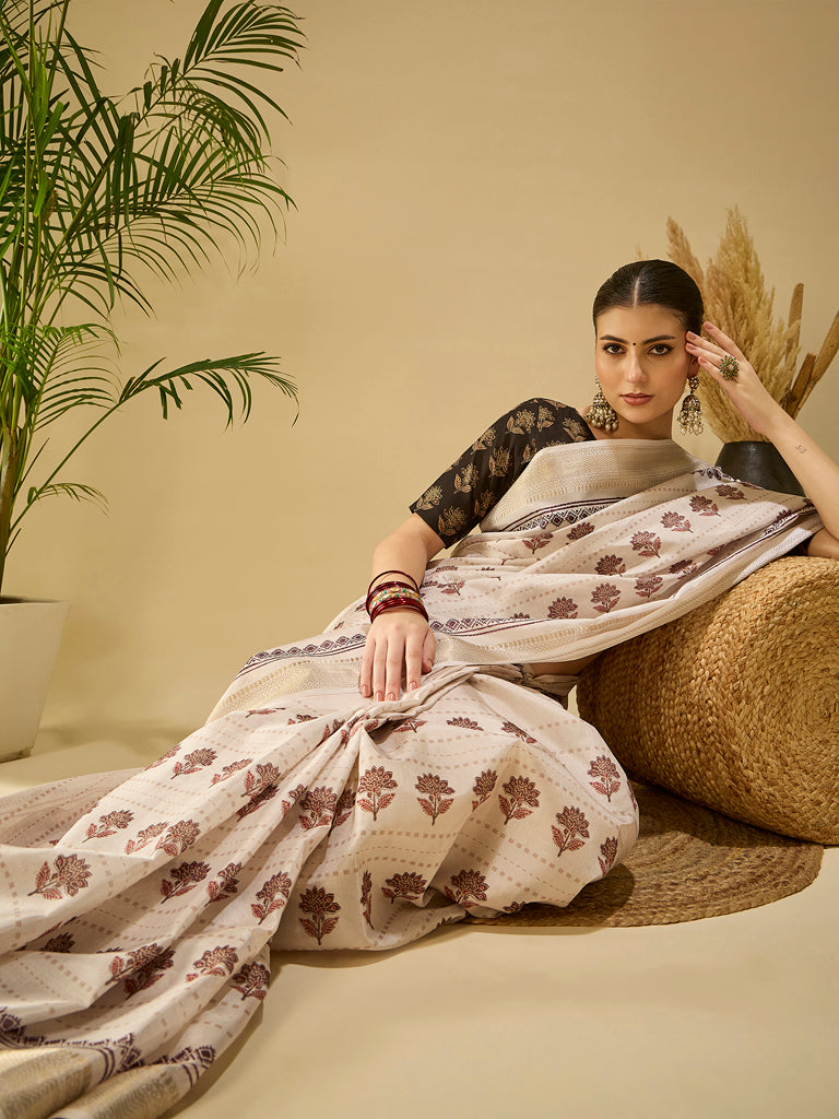 Elegant and minimal, the Aadrika Saree features delicate buti motifs on an off-white Katki silk base, finished with a subtle border. Lightweight and graceful, it’s perfect for day wear or casual gatherings.