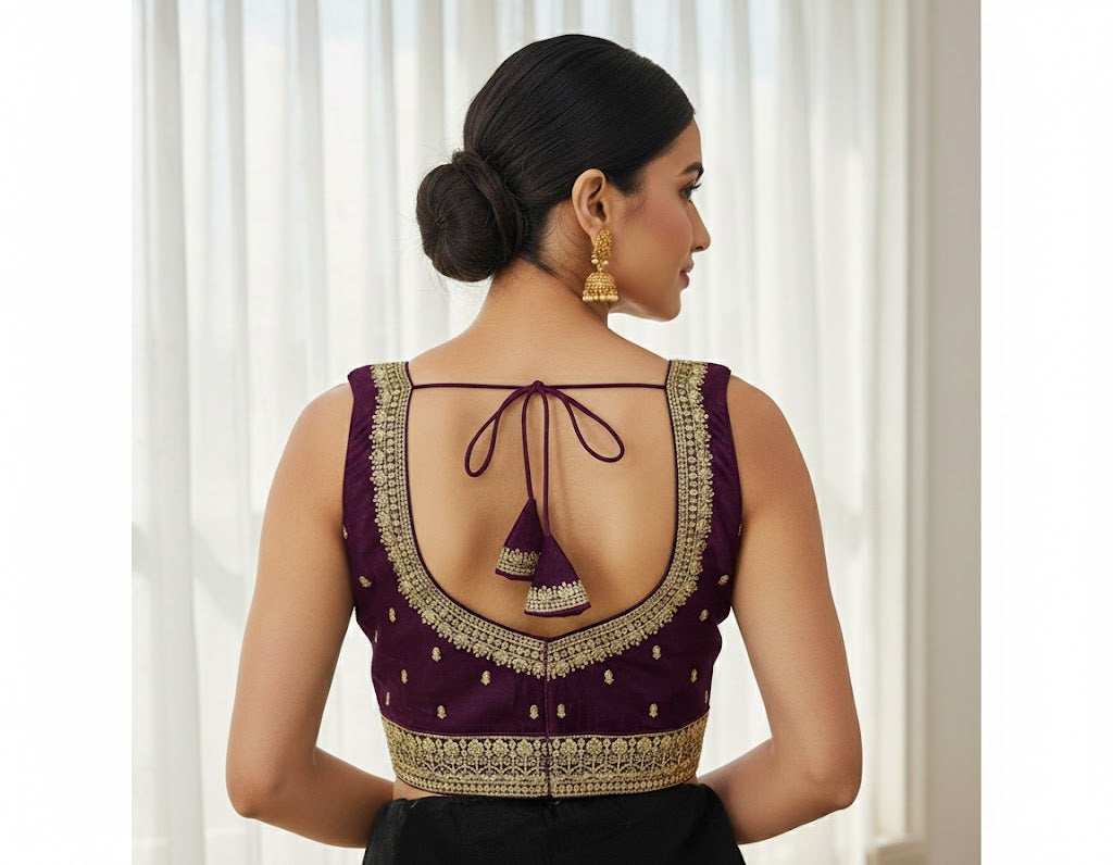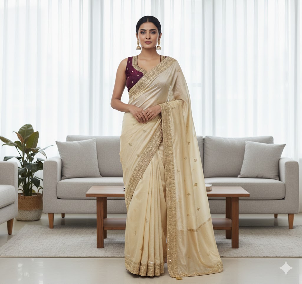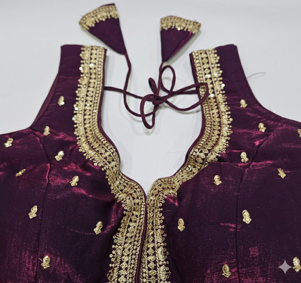The Tvesa Blouse in rayon silk combines comfort and versatility. It comes with cut sleeves and an optional attachable half sleeve, making it adaptable for various looks. With small ditsy embroidery and border detailing, this blouse pairs beautifully with both printed and plain sarees.