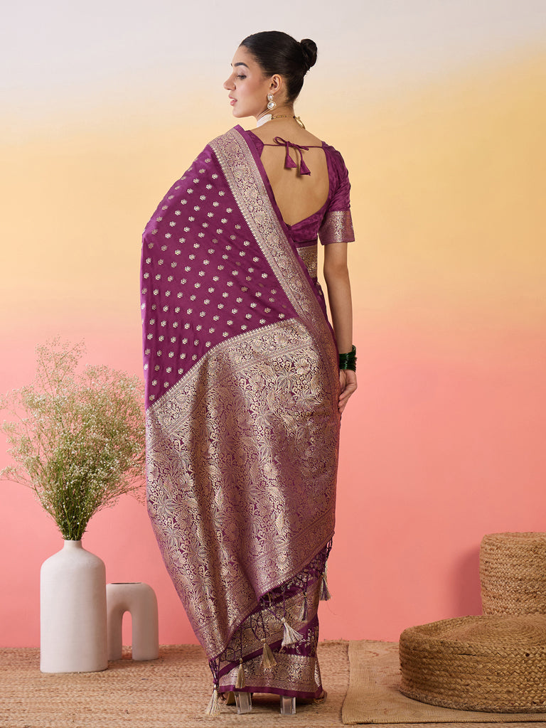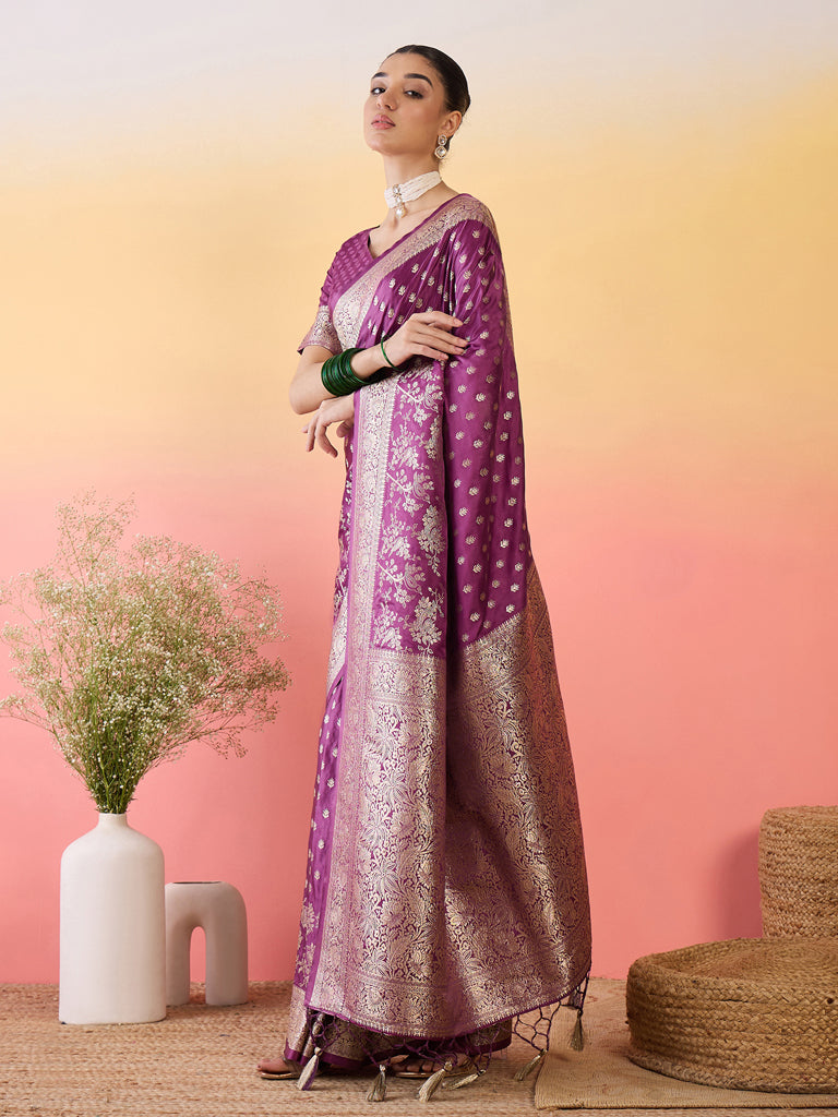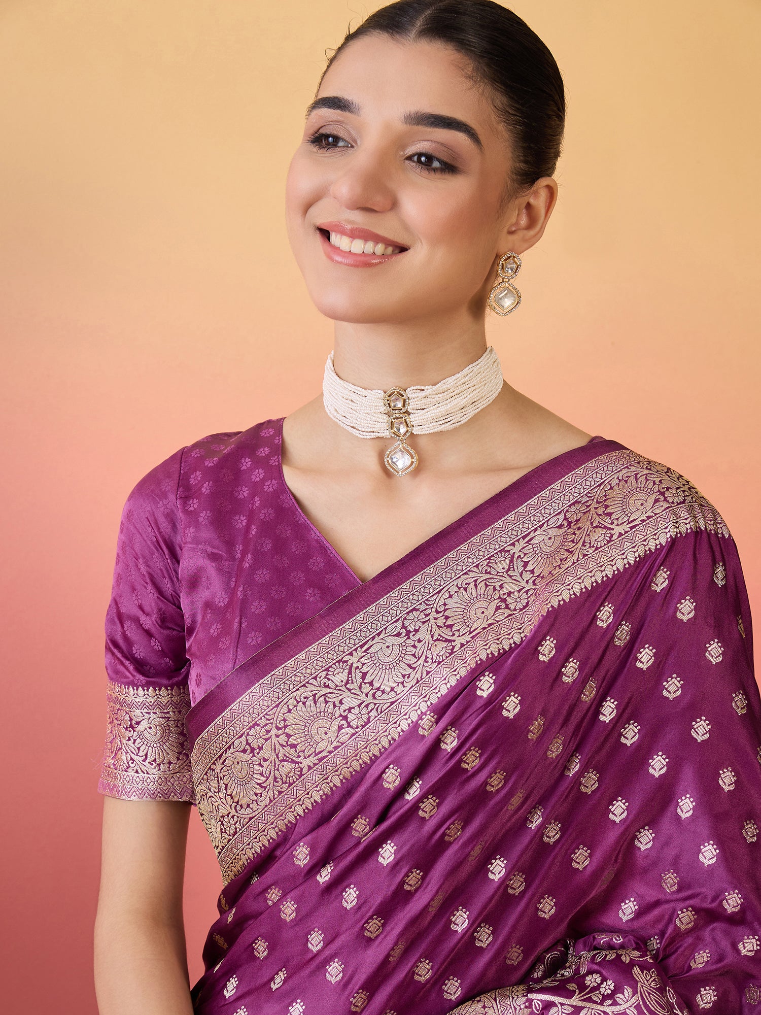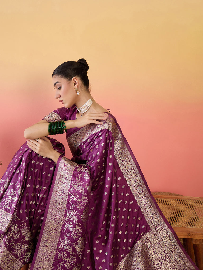 The Vaati Saree in pure satin silk exudes royal elegance with its Banarasi-style jaal and buti weaving. The soft satin finish adds a regal sheen, making it perfect for festive and wedding occasions.