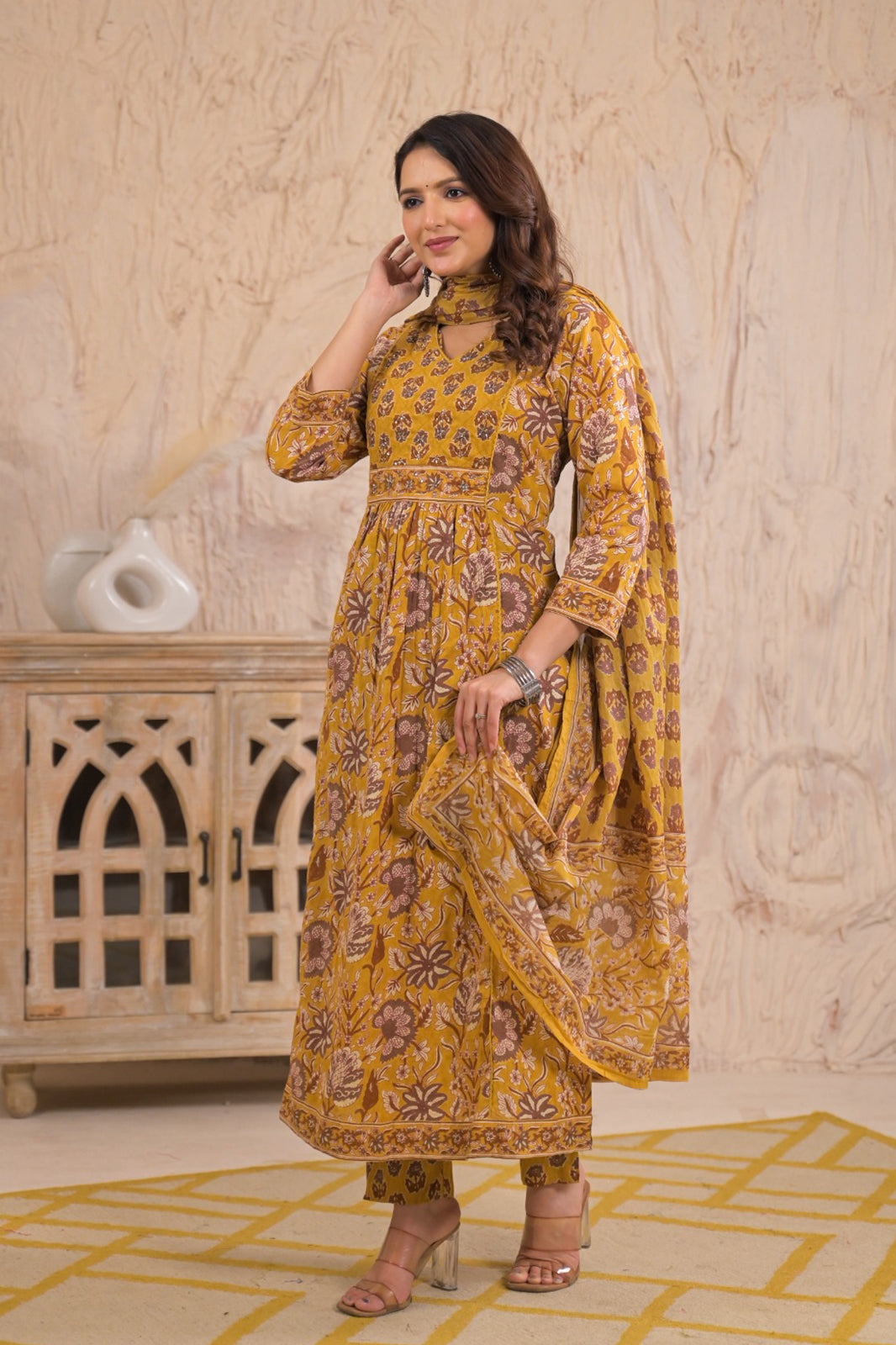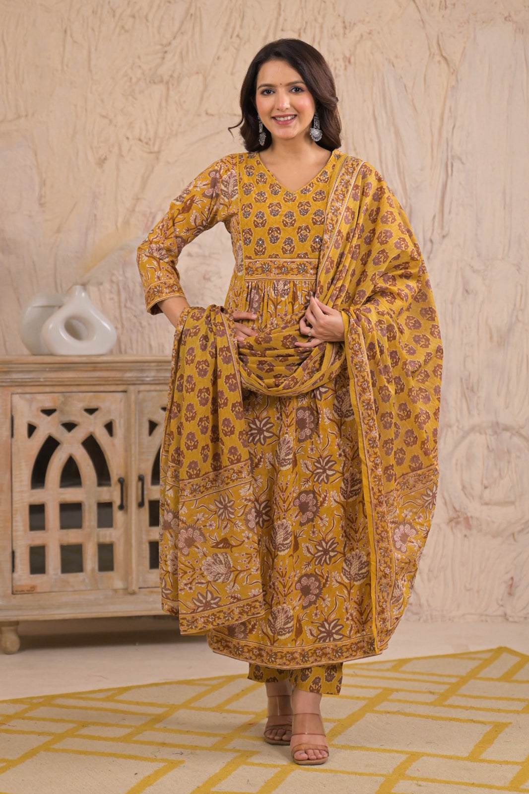 The Gulnaar Suit Set is a graceful blend of tradition and detail, designed to elevate your everyday ethnic wardrobe. This 3-piece set includes a beautifully printed flared kurta, paired with a solid pant and a complementing dupatta.