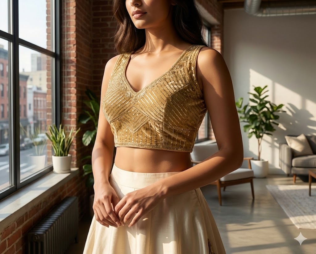 Note: This blouse comes in free size. We do not provide alterations, but an ample margin inside allows resizing as needed.
